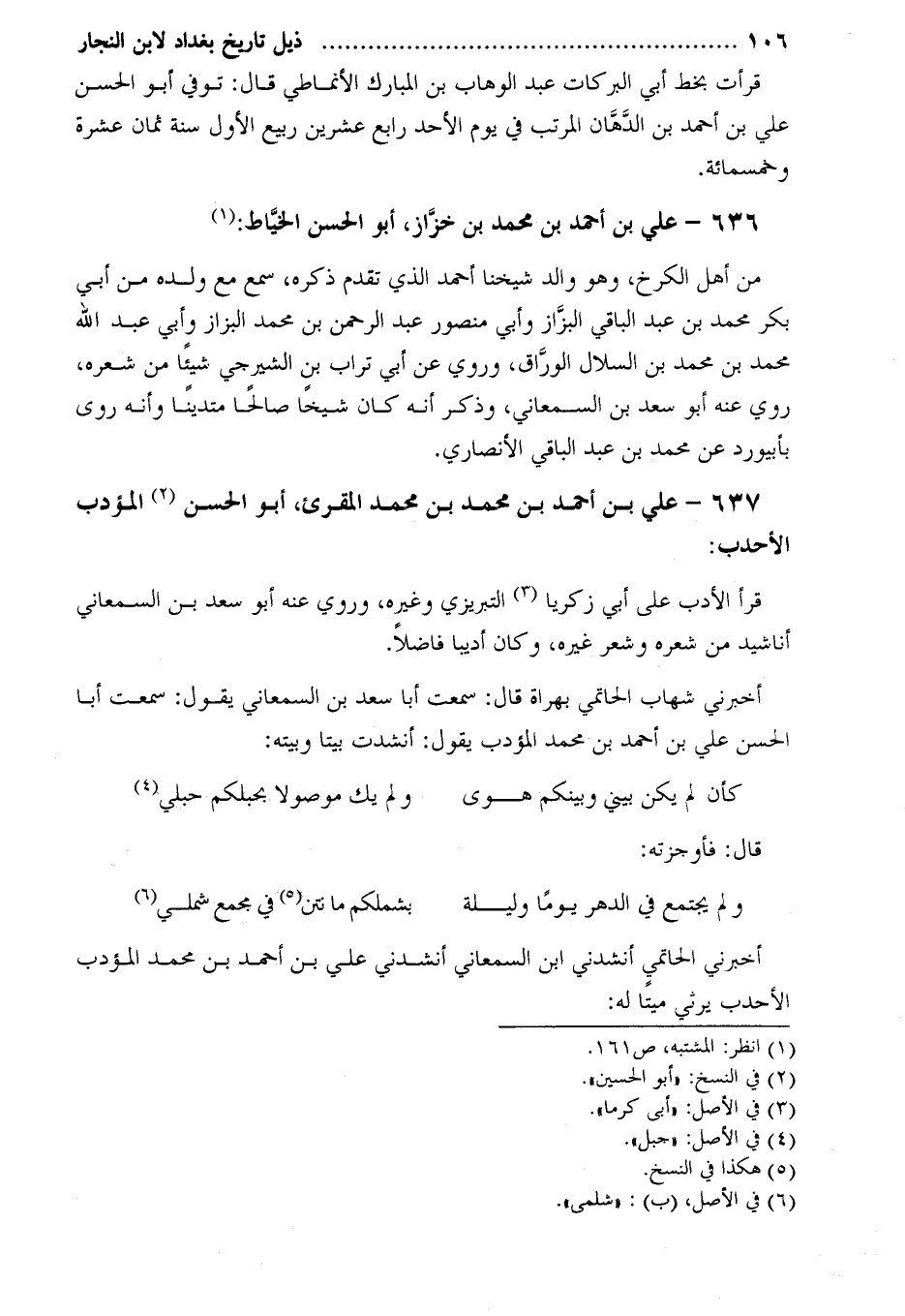 أخبرني شهاب الحاتمي بهراة قال: سمعت أبا سعد بن السمعاني يقول: سمعت أبا الحسن علي بن أَحْمَد بن مُحَمَّد المؤدب يقول: أنشدت بيتا وبيته:
