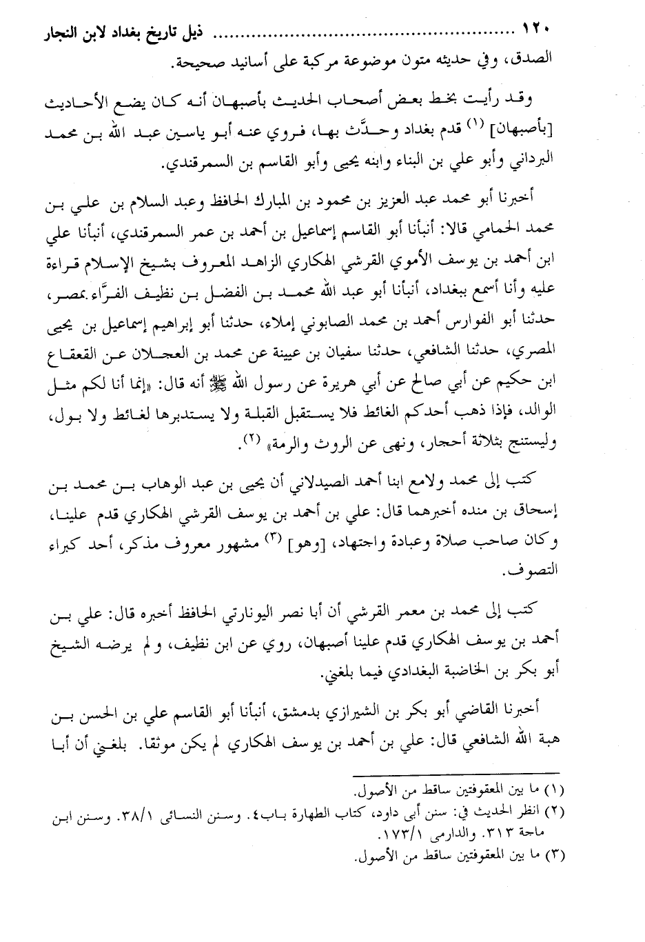 أَخْبَرَنَا أَبُو مُحَمَّدٍ عَبْدُ الْعَزِيزِ بْنُ مَحْمُودِ بْنِ الْمُبَارَكِ الْحَافِظُ وَعَبْدُ السَّلامِ بْنُ علي بن محمد الحمامي قالا: أنبأنا أبو القاسم إسماعيل بن أحمد بن عمر السمرقندي، أنبأنا علي ابن أَحْمَدَ بْنِ يُوسُفَ الأُمَوِيُّ الْقُرَشِيُّ الْهَكَّارِيُّ الزَّاهِدُ الْمَعْرُوفُ بِشَيْخِ الإِسْلامِ قِرَاءَةً عَلَيْهِ وَأَنَا أَسْمَعُ ببغداد، أنبأنا أَبُو عَبْد اللَّه مُحَمَّد بْن الفضل بْن نظيف الفرّاء بمصر، حدثنا أَبُو الْفَوَارِسِ أَحْمَدُ بْنُ مُحَمَّدٍ الصَّابُونِيُّ إِمْلاءً، حدثنا أبو إبراهيم إسماعيل بن يحيى المصري، حدثنا الشافعي، حدثنا سُفْيَانُ بْنُ عُيَيْنَةَ عَنْ مُحَمَّدِ بْنِ الْعَجْلانِ عن القعقاع ابن حَكِيمٍ عَنْ أَبِي صَالِحٍ عَنْ أَبِي هُرَيْرَةَ عَنِ رَسُولِ اللَّهِ صَلَّى اللَّهُ عَلَيْهِ وَسَلَّمَ أَنَّهُ قَالَ: «إِنَّمَا أَنَا لَكُمْ مِثْلُ الْوَالِدِ، فَإِذَا ذَهَبَ أَحَدُكُمُ الْغَائِطَ فَلا يَسْتَقْبِلِ الْقِبْلَةَ وَلا يَسْتَدْبِرْهَا لِغَائِطٍ وَلا بَوْلٍ، وَلْيَسْتَنْجِ بِثَلاثَةِ أَحْجَارٍ، وَنَهَى عَنِ الرَّوْثِ وَالرِّمَّةِ» [2] .