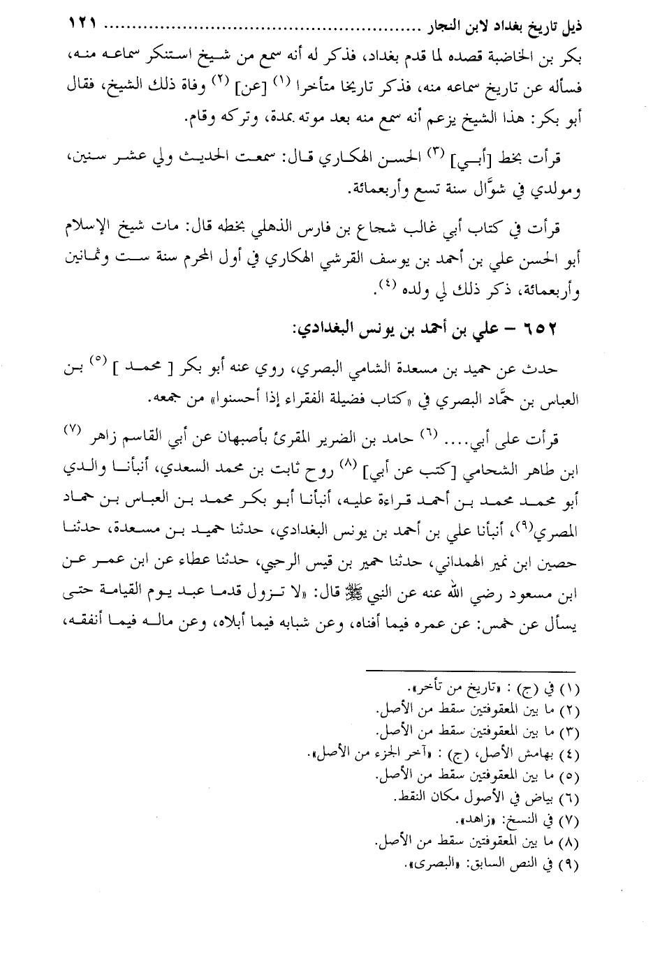 قَرَأْتُ عَلَى أَبِي.... [6] حَامِدِ بْنِ الضَّرِيرِ الْمُقْرِئِ بأصبهان عن أبي القاسم زاهر [7] ابن طَاهِرٍ الشَّحَّامِيِّ [كَتَبَ عَنْ أَبِي] [8] رَوْحٍ ثَابِتِ بن محمد السعدي، أنبأنا وَالِدِي أَبُو مُحَمَّدٍ مُحَمَّدُ بْنُ أَحْمَدَ قِرَاءَةً عليه، أنبأنا أبو بكر محمد بن العباس بن حماد المصري [9] ، أنبأنا علي بن أحمد بن يونس البغدادي، حدثنا حميد بن مسعدة، حدثنا حصين ابن نمير الهمداني، حدثنا حمير بن قيس الرحبي، حدثنا عَطَاءٌ عَنِ ابْنِ عُمَرَ عَنِ ابْنِ مَسْعُودٍ رَضِيَ اللَّهُ عَنْهُ عَنِ النَّبِيِّ صَلَّى اللَّهُ عَلَيْهِ وَسَلَّمَ قَالَ: «لا تَزُولُ قَدَمَا عَبْدٍ يَوْمَ الْقِيَامَةِ حَتَّى يُسْأَلَ عَنْ خَمْسٍ: عَنْ عُمُرِهِ فِيمَا أَفْنَاهُ، وَعَنْ شَبَابِهِ فِيمَا أَبْلاهُ، وعن ماله فيما أنفقه،