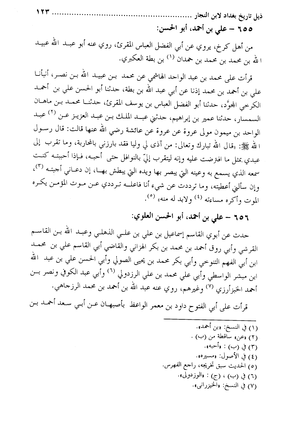 قَرَأْتُ عَلَى مُحَمَّدِ بْنِ عَبْدِ الْوَاحِدِ الْهَاشِمِيُّ عَنْ مُحَمَّدِ بْنِ عُبَيْدِ اللَّهِ بن نصر، أنبأنا علي بن أحمد بن محمد إذنا عن أبي عَبْدِ اللَّهِ بْنِ بَطَّةَ، حَدَّثَنَا أَبُو الْحَسَنِ عَلِيُّ بْنُ أَحْمَدَ الْكَرْخِيُّ الْمُجَوِّدُ، حَدَّثَنَا أَبُو الفضل العباس بن يوسف المقرئ، حدثنا محمد بن ماهان السمسار، حدثنا عُمَيْرُ بْنُ إِبْرَاهِيمَ، حَدَّثَنِي عَبْدُ الْمَلِكِ بْنُ عَبْدِ الْعَزِيزِ عَنْ [2] عَبْدُ الْوَاحِدِ بْنُ مَيْمُونٍ مَوْلَى عُرْوَةَ عَنْ عُرْوَةَ عَنْ عَائِشَةَ رَضِيَ الله عنها قَالَتْ: قَالَ رَسُولُ اللَّهِ صَلَّى اللَّهُ عَلَيْهِ وَسَلَّمَ: «قَالَ اللَّهُ تَبَارَكَ وَتَعَالَى: مَنْ آذَى لِي وَلِيًّا فَقَدْ بَارَزَنِي بِالْمُحَارَبَةِ، وَمَا تَقَرَّبَ إِلَيَّ عَبْدِي بِمِثْلِ مَا افْتَرَضْتُ عَلَيْهِ وَإِنَّهُ لَيَتَقَرَّبُ إِلَيَّ بِالنَّوَافِلِ حَتَّى أُحِبَّهُ، فَإِذَا أَحْبَبْتُهُ كُنْتُ سَمْعَهُ الَّذِي يَسْمَعُ بِهِ وَعَيْنَهُ الَّتِي يُبْصِرُ بِهَا وَيَدَهُ الَّتِي يَبْطِشُ بِهَا، إِنْ دَعَانِي أَجَبْتُهُ [3] ، وَإِنْ سَأَلَنِي أَعْطَيْتُهُ، وَمَا تَرَدَّدْتُ عَنْ شَيْءٍ أَنَا فَاعِلُهُ تَرَدُّدِي عَنْ مَوْتِ الْمُؤْمِنِ يَكْرَهُ الْمَوْتَ وَأَكْرَهُ مَسَاءَتَهُ [4] وَلا بُدَّ لَهُ مِنْهُ» [5] .