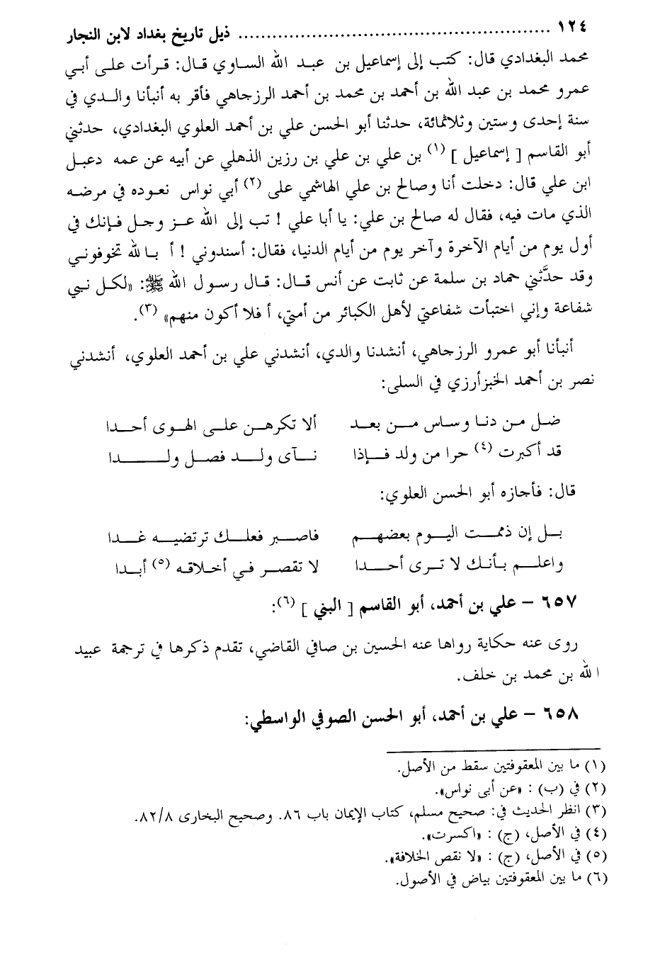 مُحَمَّدٍ الْبَغْدَادِيِّ قَالَ: كَتَبَ إِلَيَّ إِسْمَاعِيلُ بْنُ عَبْدِ اللَّهِ السَّاوِيُّ قَالَ: قَرَأْتُ عَلَى أَبِي عمرو مُحَمَّد بْن عَبْد اللَّه بْن أَحْمَد بْن محمد بن أحمد الرزجاهي فأقر به أنبأنا والدي في سنة إحدى وستين وثلاثمائة، حدثنا أَبُو الْحَسَنِ عَلِيُّ بْنُ أَحْمَدَ الْعَلَوِيُّ الْبَغْدَادِيُّ، حَدَّثَنِي أَبُو الْقَاسِمِ [إِسْمَاعِيلُ] [1] بْنُ عَلِيِّ بْنِ عَلِيِّ بْنِ رَزِينٍ الذُّهْلِيُّ عَنْ أَبِيهِ عَنْ عمه دعبل ابن عَلِيٍّ قَالَ: دَخَلْتُ أَنَا وَصَالِحُ بْنُ عَلِيٍّ الْهَاشِمِيُّ عَلَى [2] أَبِي نُوَاسٍ نَعُودُهُ فِي مَرَضِهِ الَّذِي مَاتَ فِيهِ، فَقَالَ لَهُ صَالِحُ بْنُ عَلِيٍّ: يَا أَبَا عَلِيٍّ! تُبْ إِلَى اللَّهِ عَزَّ وَجَلَّ فَإِنَّكَ فِي أَوَّلِ يَوْمٍ مِنْ أَيَّامِ الآخِرَةِ وَآخِرِ يَوْمٍ مِنْ أَيَّامِ الدُّنْيَا، فَقَالَ: أَسْنِدُونِي! أَبِاللَّهِ تُخَوِّفُونِي وَقَدْ حَدَّثَنِي حَمَّادُ بْنُ سَلَمَةَ عَنْ ثَابِتٍ عَنْ أَنَسٍ قَالَ: قَالَ رَسُولُ اللَّهِ صَلَّى اللَّهُ عَلَيْهِ وَسَلَّمَ: «لِكُلِّ نَبِيٍّ شَفَاعَةٌ وَإِنِّي اخْتَبَأْتُ شَفَاعَتِي لأَهْلِ الْكَبَائِرِ مِنْ أُمَّتِي، أَفَلا أَكُونُ مِنْهُمْ» [3] .