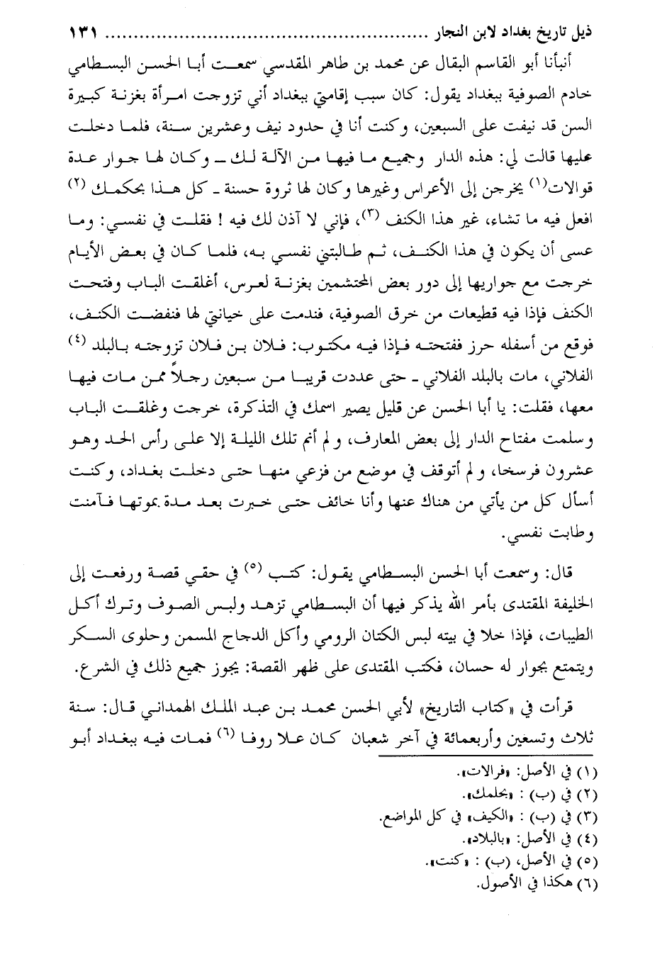 قال: وسمعت أبا الحسن البسطامي يقول: كتب [5] في حقي قصة ورفعت إلى الخليفة المقتدي بأمر الله يذكر فيها أن البسطامي تزهد ولبس الصوف وترك أكل الطيبات، فإذا خلا في بيته لبس الكتان الرومي وأكل الدجاج المسمن وحلوى السكر ويتمتع بجوار له حسان، فكتب المقتدي عَلَى ظهر القصة: يجوز جميع ذلك في الشرع.