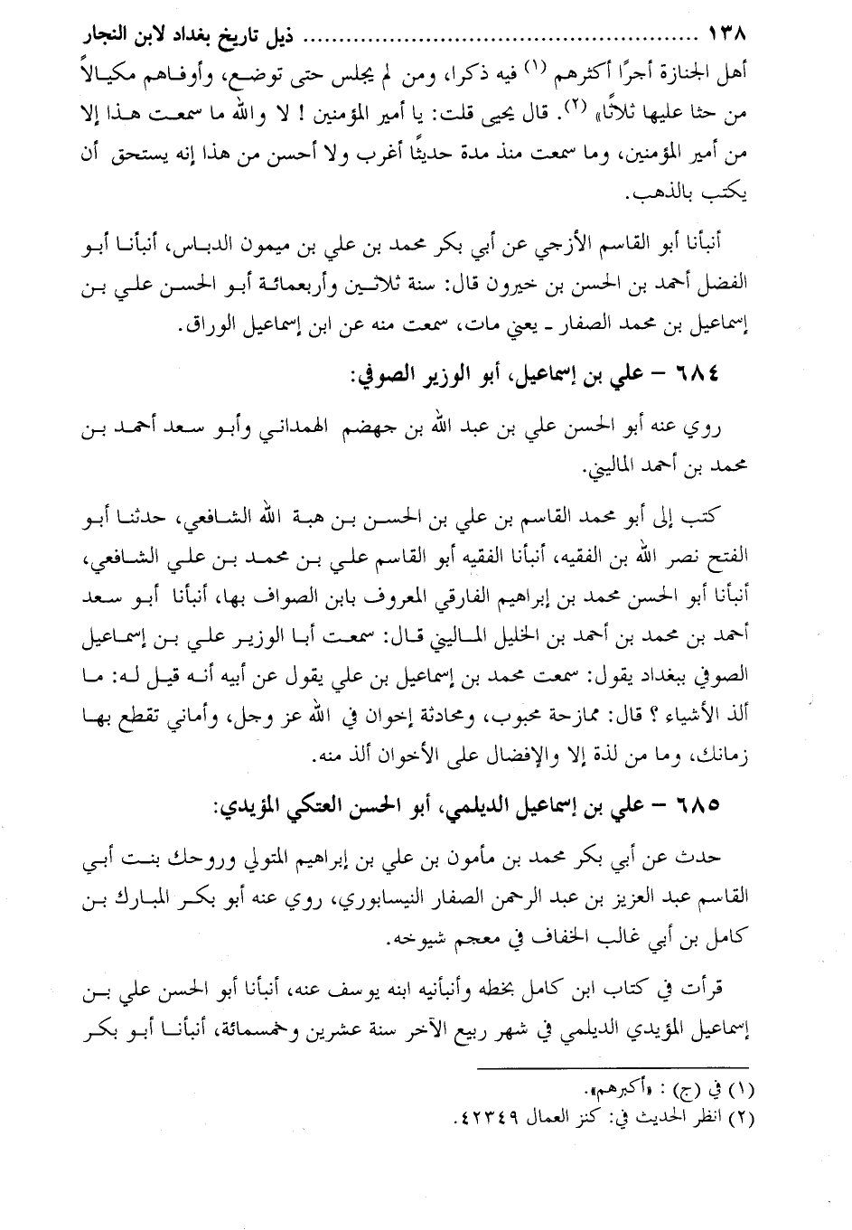 قَرَأْتُ فِي كِتَابِ ابْنِ كَامِلٍ بِخَطِّهِ وَأَنْبَأَنِيهِ ابْنُهُ يُوسُفُ عنه، أنبأنا أَبُو الْحَسَنِ عَلِيُّ بْنُ إِسْمَاعِيلَ الْمُؤَيَّدِيُّ الدَّيْلَمِيُّ في شهر ربيع الآخر سنة عشرين وخمسمائة، أنبأنا أبو بكر