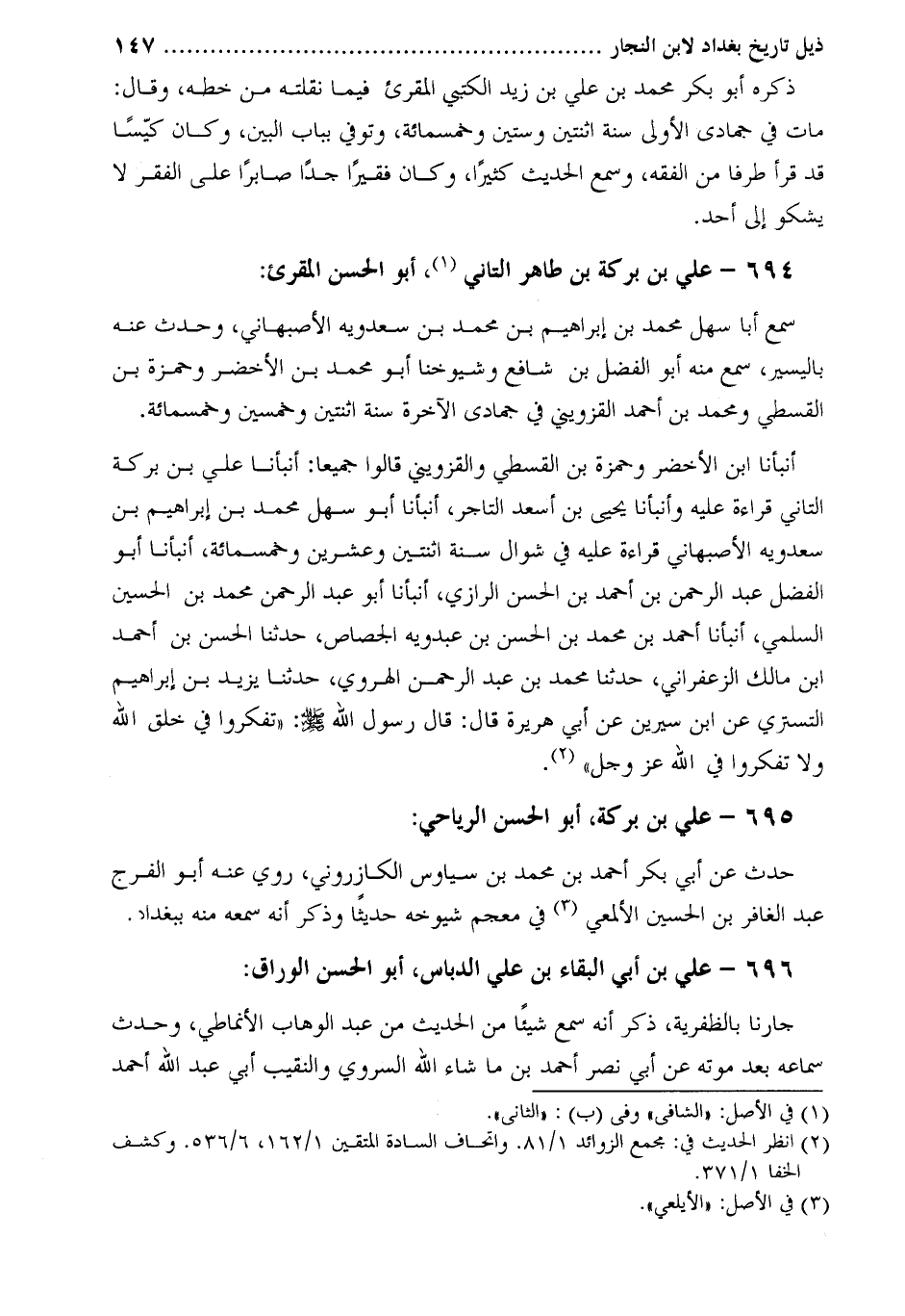 أَنْبَأَنَا ابْنُ الأَخْضَرِ وَحَمْزَةُ بْنُ الْقسطِيِّ وَالْقَزْوِينِيُّ قالوا جميعا: أنبأنا علي بن بركة التاني قراءة عليه وأنبأنا يحيى بن أسعد التاجر، أنبأنا أَبُو سَهْلٍ مُحَمَّدُ بْنُ إِبْرَاهِيمَ بْنِ سَعْدُوَيْهِ الأَصْبَهَانِيُّ قِرَاءَةً عَلَيْهِ فِي شَوَّالٍ سَنَةَ اثْنَتَيْنِ وعشرين وخمسمائة، أنبأنا أَبُو الْفَضْلِ عَبْد الرَّحْمَن بْن أَحْمَد بْن الحسن الرازي، أنبأنا أَبُو عَبْد الرَّحْمَن مُحَمَّد بْن الْحُسَيْن السلمي، أنبأنا أَحْمَدُ بْنُ مُحَمَّدِ بْنِ الْحَسَنِ بْنِ عَبْدُوَيْهِ الجصاص، حدثنا الحسن بن أحمد ابن مالك الزعفراني، حدثنا محمد بن عبد الرحمن الهروي، حدثنا يَزِيدُ بْنُ إِبْرَاهِيمَ التُّسْتَرِيُّ عَنِ ابْنِ سِيرِينَ عَنْ أَبِي هُرَيْرَةَ قَالَ: قَالَ رَسُولُ اللَّهِ صَلَّى اللَّهُ عَلَيْهِ وَسَلَّمَ: «تَفَكَّرُوا فِي خَلْقِ اللَّهِ وَلا تَفَكَّرُوا فِي اللَّهِ عَزَّ وَجَلَّ» [2] .