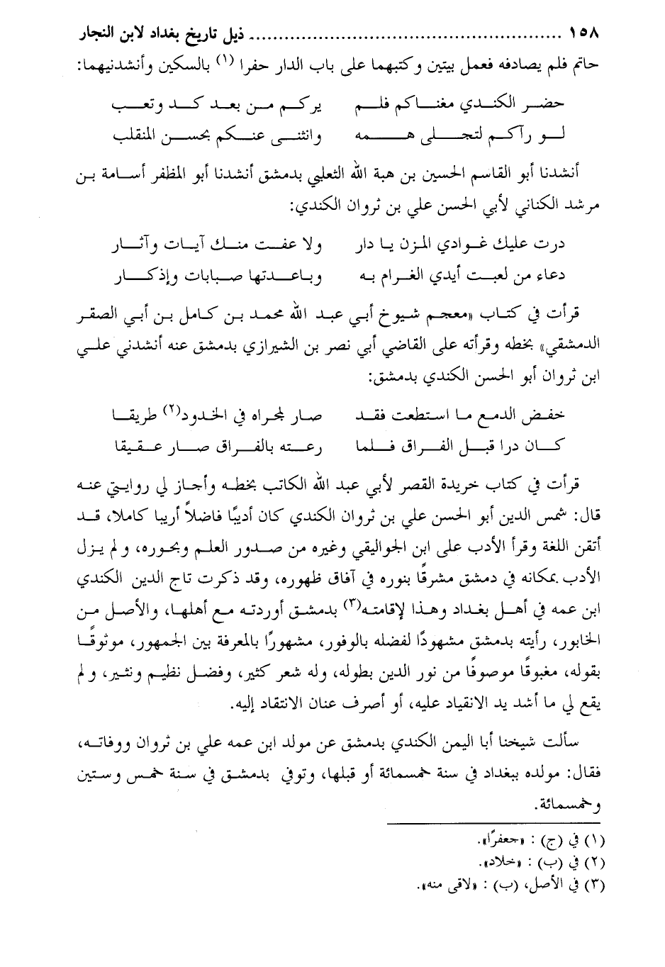 قرأت في كتاب «معجم شيوخ أبي عبد الله مُحَمَّد بن كامل بن أبي الصقر الدمشقي» بخطه وقرأته على القاضي أبي نصر بن الشيرازي بدمشق عنه أنشدني علي ابن ثروان أبو الحسن الكندي بدمشق:
