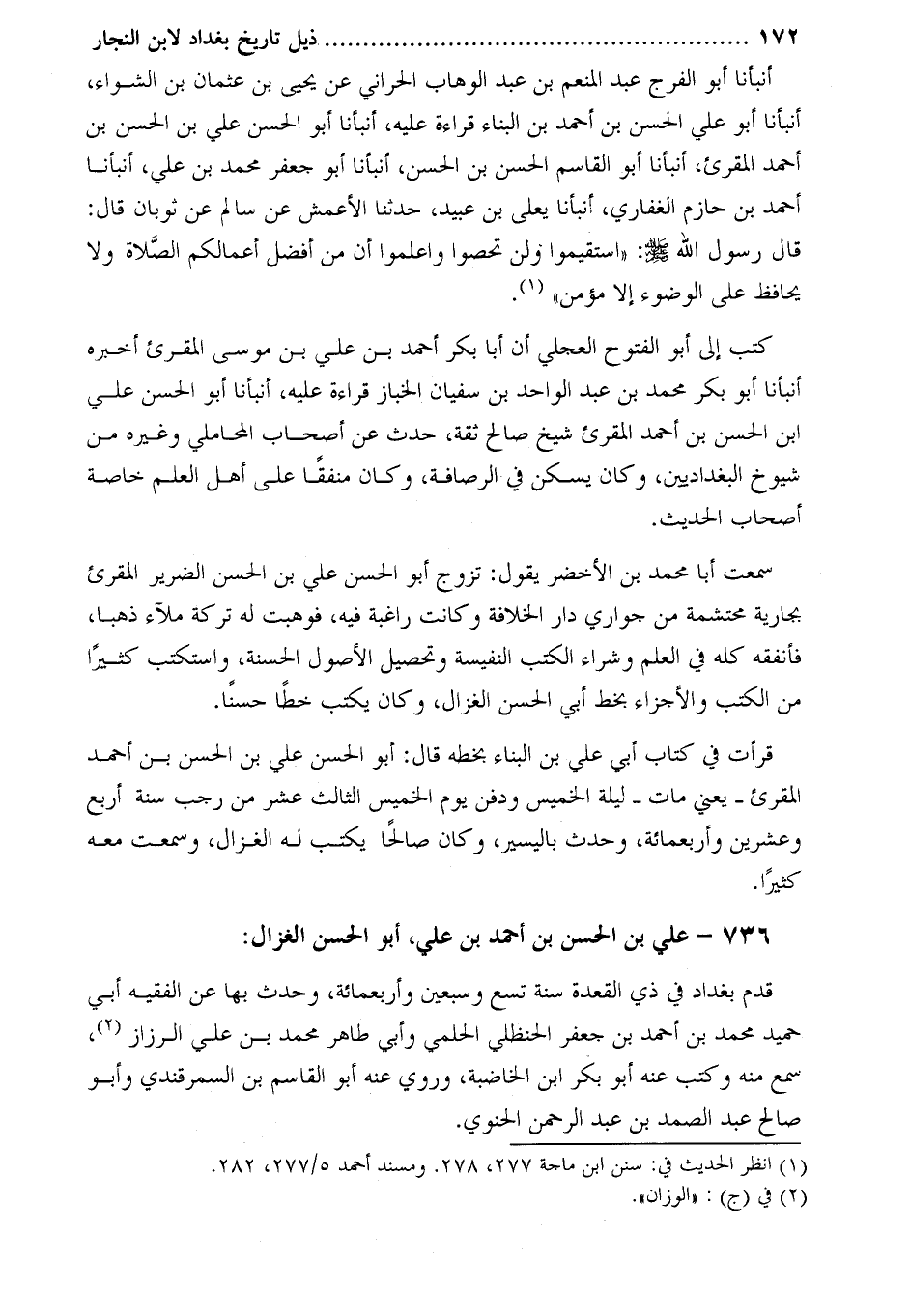 أنبأنا أبو الفرج عبد المنعم بن عبد الْوَهَّابِ الْحَرَّانِيُّ عَنْ يَحْيَى بْنِ عُثْمَانَ بْنِ الشواء، أنبأنا أبو علي الحسن بن أحمد بن البناء قراءة عليه، أنبأنا أَبُو الْحَسَنِ عَلِيُّ بْنُ الْحَسَنِ بْنِ أَحْمَدَ المقرئ، أنبأنا أبو القاسم الحسن بن الحسن، أنبأنا أبو جعفر محمد بن علي، أنبأنا أحمد بن حازم الغفاري، أنبأنا يعلى بن عبيد، حدثنا الأَعْمَشِ عَنْ سَالِمٍ عَنْ ثَوْبَانَ قَالَ: