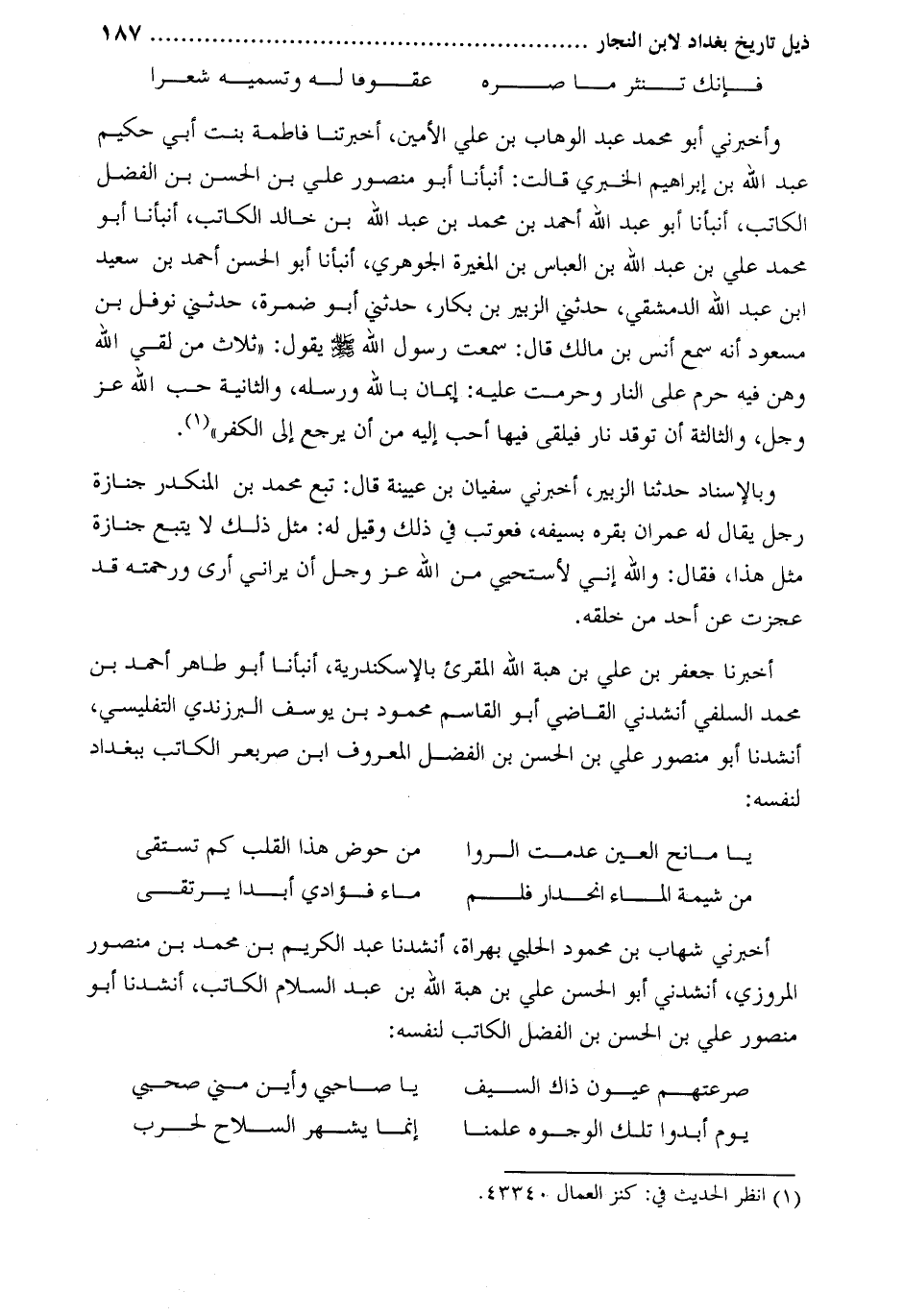 وَأَخْبَرَنِي أَبُو مُحَمَّدٍ عَبْدُ الْوَهَّابِ بْنُ عَلِيٍّ الأَمِينُ، أَخْبَرَتْنَا فَاطِمَةُ بِنْتُ أَبِي حَكِيمٍ عَبْد اللَّه بْن إبراهيم الخبري قالت: أنبأنا أبو منصور علي بن الحسن بن الفضل الكاتب، أنبأَنَا أَبُو عَبْد اللَّهِ أَحْمَد بْن مُحَمَّد بن عبد الله بن خالد الكاتب، أنبأنا أبو محمد علي بن عبد الله بن العباس بن المغيرة الجوهري، أنبأنا أبو الحسن أحمد بن سعيد ابن عبد الله الدمشقي، حدثني الزُّبَيْرُ بْنُ بَكَّارٍ، حَدَّثَنِي أَبُو ضَمْرَةَ، حَدَّثَنِي نَوْفَلُ بْنُ مَسْعُودٍ أَنَّهُ سَمِعَ أَنَسِ بْنِ مَالِكٍ قَالَ: سَمِعْتُ رَسُولَ اللَّهِ صَلَّى اللَّهُ عَلَيْهِ وَسَلَّمَ يَقُولُ: «ثَلاثٌ مَنْ لَقِيَ اللَّهَ وَهُنَّ فِيهِ حُرِّمَ عَلَى النَّارِ وَحُرِّمَتْ عَلَيْهِ: إِيمَانٌ بِاللَّهِ وَرُسُلِهِ، وَالثَّانِيَةُ حُبُّ اللَّهِ عَزَّ وَجَلَّ، وَالثَّالِثَةُ أَنْ تُوقَدَ نَارٌ فَيُلْقَى فِيهَا أَحَبُّ إِلَيْهِ مِنْ أَنْ يَرْجِعَ إِلَى الْكُفْرِ» [1] .