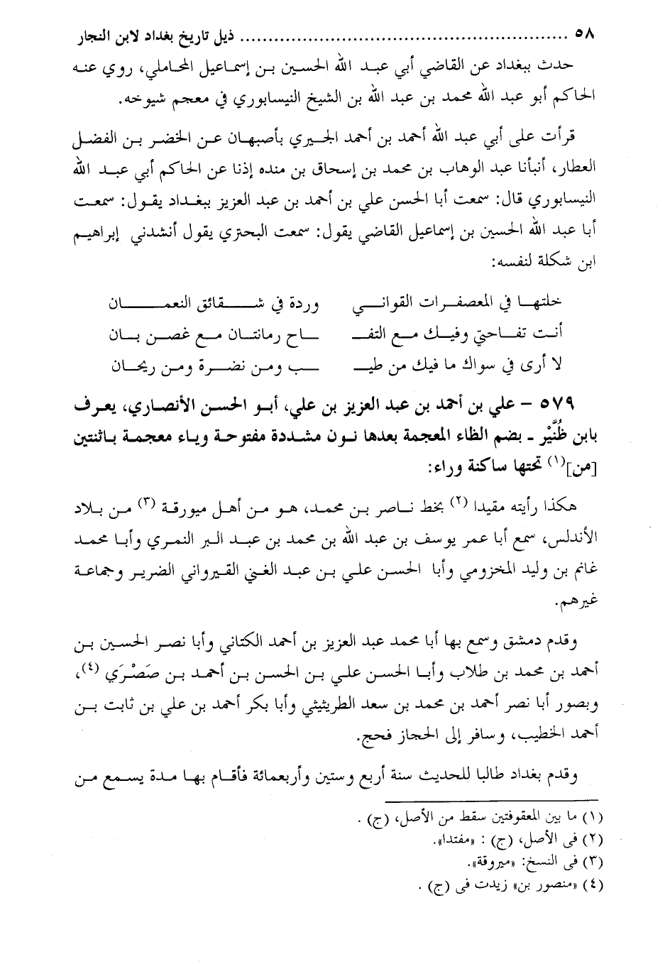 579- علي بْن أَحْمَد بْن عَبْد العزيز بْن علي، أَبُو الْحَسَن الأَنْصَارِيّ، يعرف بابن ظنير- بضم الظاء المعجمة بعدها نون مشددة مفتوحة وياء معجمة باثنتين [من] [1] تحتها ساكنة وراء: