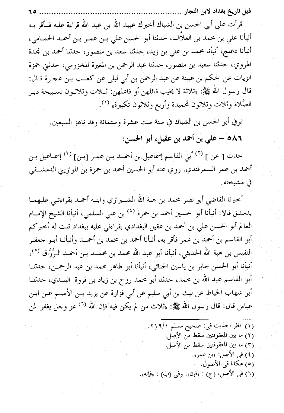 أَخْبَرَنَا الْقَاضِي أَبُو نَصْرٍ مُحَمَّدُ بْنُ هِبَةِ اللَّهِ الشِّيرَازِيُّ وَابْنُهُ أَحْمَدُ بقراءتي عليهما بدمشق قالا: أنبأنا أَبُو الْحُسَيْنِ أَحْمَدُ بْنُ حَمْزَةَ [4] بْنِ عَلِيٍّ السُّلَمِيُّ، أَنْبَأَنَا الشَّيْخُ الإِمَامُ الْعَالِمُ أَبُو الْحَسَنِ عَلِيُّ بْنُ أَحْمَدَ بْنِ عُقَيْلٍ الْبَغْدَادِيُّ بِقِرَاءَتِي عَلَيْهِ بِبَغْدَادَ قُلْتُ لَهُ أَخْبَرَكُمْ أَبُو الْقَاسِمِ بن أحمد بن عمر فأقر به، أنبأنا أحمد بن محمد بن أحمد وأنبأنا أَبُو جَعْفَرٍ النَّفِيسُ بْنُ هِبَةِ اللَّهِ الْحَدِيثِيُّ، أنبأنا أبو عبد الله محمد بن محمد بن أحمد الرّزّاق [5] ، أنبأنا أَبُو الْحَسَنِ جَابِرُ بْنُ يَاسِينَ الْحِنَّائِيُّ، أَنْبَأَنَا أبو طاهر محمد بن عبد الرحمن، حَدَّثَنَا أَبُو الْقَاسِمِ عَبْدُ اللَّهِ بْنُ مُحَمَّدِ، حدثنا أَبُو مُحَمَّدٍ رَوْحُ بْنُ زِيَادِ بْنِ فَرْوَةَ البلدي، حدثنا أَبُو شِهَابٍ الْخَيَّاطُ عَنْ لَيْثِ بْنِ أَبِي سُلَيْمٍ عَنْ أَبِي فَزَارَةَ عَنْ يَزِيدَ بْنِ الأَصَمِّ عَنِ ابْنِ عَبَّاسٍ قَالَ: قَالَ رَسُولُ اللَّهِ صَلَّى اللَّهُ عَلَيْهِ وَسَلَّمَ: «ثَلاثٌ مَنْ لَمْ يَكُنَّ فِيهِ فَإِنَّ اللَّهَ [6] عَزَّ وَجَلَّ يغفر لمن