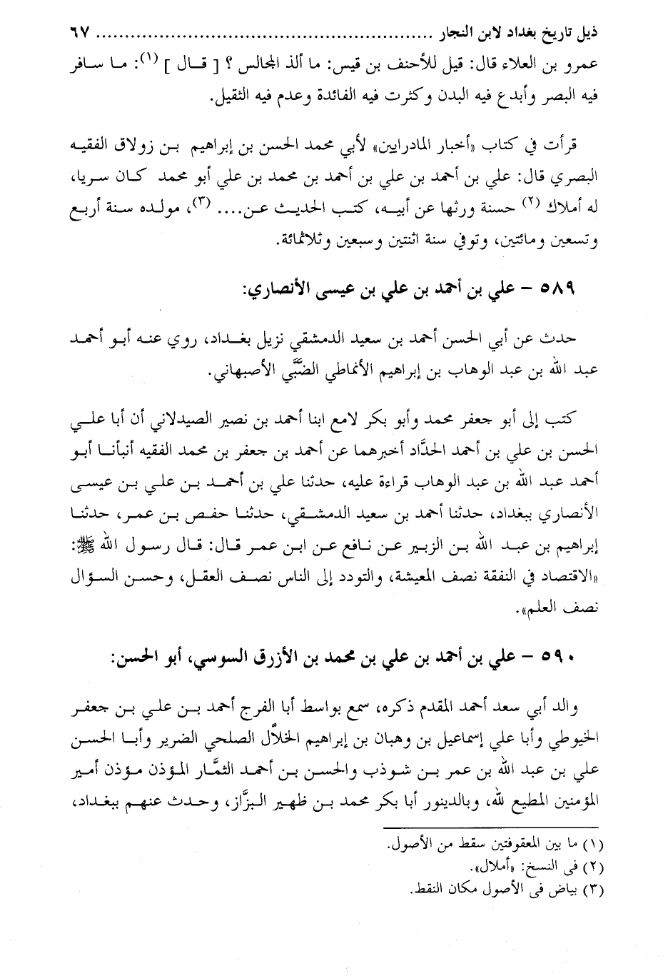 كَتَبَ إِلَيَّ أَبُو جعفر محمد وأبو بكر لامع ابنا أحمد بْنِ نُصَيْرٍ الصَّيْدَلانِيِّ أَنَّ أَبَا عَلِيٍّ الْحَسَنَ بْنَ عَلِيِّ بْنِ أَحْمَدَ الْحَدَّادَ أَخْبَرَهُمَا عَنْ أحمد بن جعفر بن محمد الفقيه أنبأنا أبو أحمد عبد الله بن عبد الوهاب قراءة عليه، حَدَّثَنَا علي بن أحمد بن علي بن عيسى الأنصاري ببغداد، حدثنا أحمد بن سعيد الدمشقي، حدثنا حفص بن عمر، حدثنا إِبْرَاهِيمُ بْنُ عَبْدِ اللَّهِ بْنِ الزُّبَيْرِ عَنْ نَافِعٍ عَنِ ابْنِ عُمَرَ قَالَ: قَالَ رَسُولُ اللَّهِ صَلَّى اللَّهُ عَلَيْهِ وَسَلَّمَ: «الاقْتِصَادُ فِي النَّفَقَةِ نِصْفُ الْمَعِيشَةِ، وَالتَّوَدُّدُ إِلَى النَّاسِ نِصْفُ الْعَقْلِ، وَحُسْنُ السُّؤَالِ نِصْفُ الْعِلْمِ» .