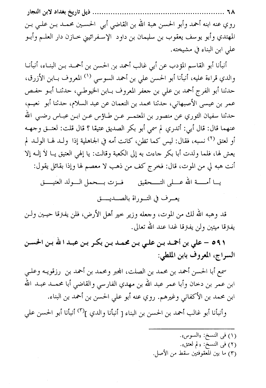591- عليّ بْن أَحْمَد بْن عليّ بْن مُحَمَّد بْن بَكْر بْن عَبْد اللَّه بْن الْحَسَن السراج، المعروف بابن الملطي: