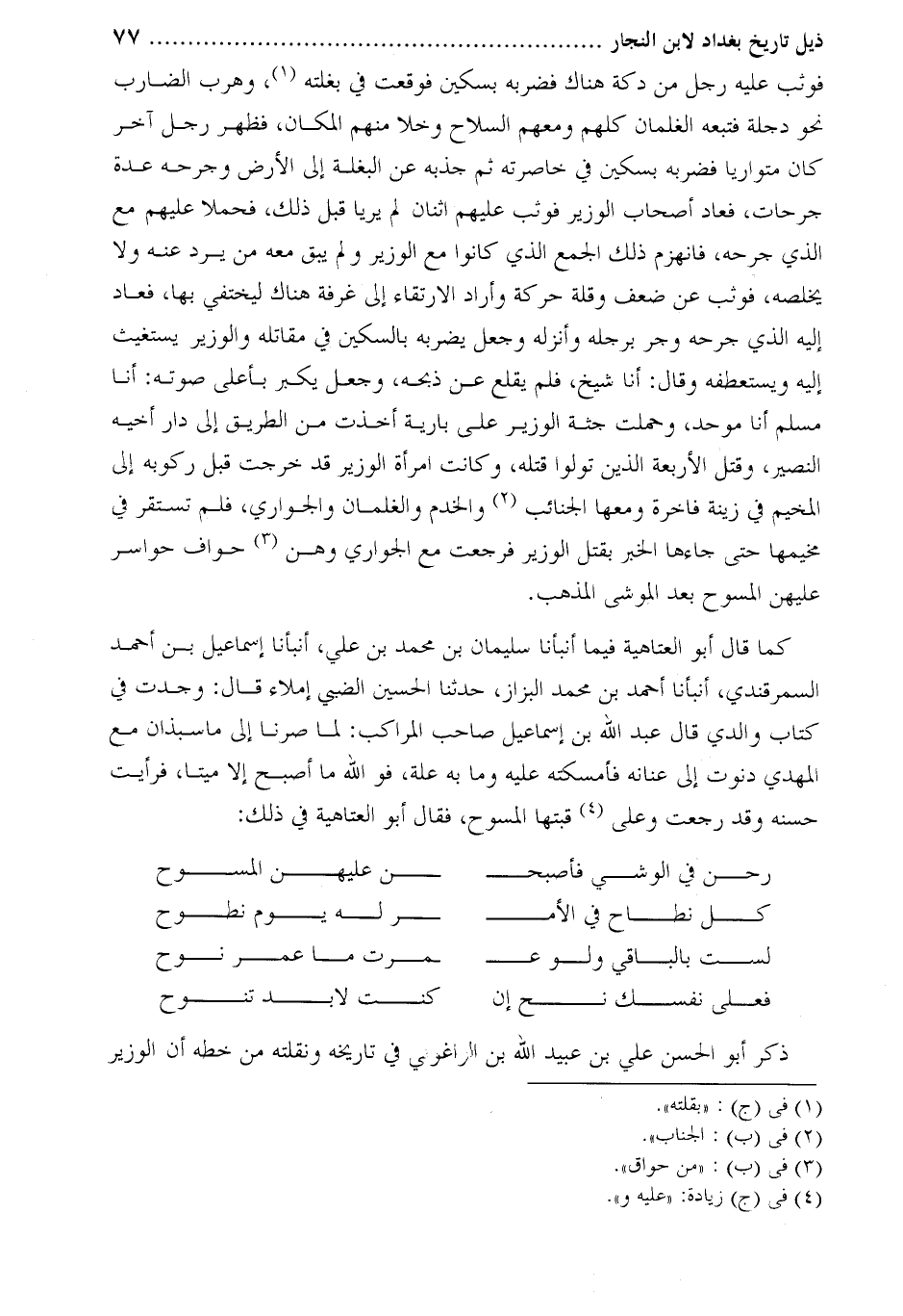 فوثب عَلَيْهِ رَجُل من دكة هناك فضربه بسكين فوقعت فِي بغلته [1] ، وهرب الضارب نحو دجلة فتبعه الغلمان كلهم ومعهم السلاح وخلا منهم المكان، فظهر رَجُل آخر كَانَ متواريًا فضربه بسكين فِي خاصرته ثُمَّ جذبه عن البغلة إلى الأرض وجرحه عدة جراحات، فعاد أصحاب الوزير فوثب عليهم اثنان لم يريا قبل ذَلِكَ، فحملا عليهم مَعَ الَّذِي جرحه، فانهزم ذَلِكَ الجمع الَّذِي كانوا مَعَ الوزير ولم يبق معه من يرد عَنْهُ ولا يخلصه، فوثب عن ضعف وقلة حركة وأراد الارتقاء إلى غرفة هناك ليختفي بها، فعاد إِلَيْه الَّذِي جرحه وجر برجله وأنزله وجعل يضربه بالسكين فِي مقاتله والوزير يستغيث إِلَيْه ويستعطفه وقَالَ: أَنَا شيخ، فلم يقلع عن ذبحه، وجعل يكبر بأعلى صوته: أَنَا مُسْلِم أَنَا موحد، وحملت جثة الوزير عَلَى بارية أخذت من الطريق إلى دار أخيه النصير، وقتل الأربعة الَّذِينَ تولوا قتله، وكانت امْرَأَة الوزير قَدْ خرجت قبل ركوبه إلى المخيم فِي زينة فاخرة ومعها الجنائب [2] والخدم والغلمان والجواري، فلم تستقر فِي مخيمها حتَّى جاءها الخبر بقتل الوزير فرجعت مَعَ الجواري وهن [3] حواف حواسر عليهن المسوح بعد الموشي المذهب.
