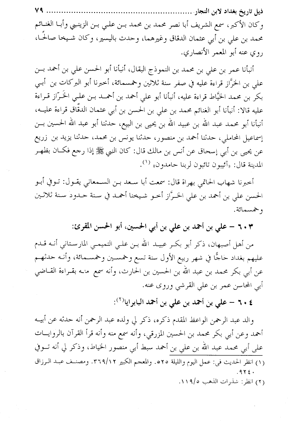 أَنْبَأَنَا عُمَرُ بْنُ عَلِيِّ بْنِ مُحَمَّدِ بْنِ النموذجِ الْبَقَّالُ، أَنْبَأَنَا أَبُو الْحَسَنِ عَلِيُّ بْنُ أَحْمَدَ بْنِ عَلِيٍّ بْن الْخَرَّازِ قِرَاءَةً عَلَيْهِ فِي صَفَرٍ سنة ثلاثين وخمسمائة، أَخْبَرَنَا أَبُو الْبَرَكَاتِ بْنُ أَبِي بَكْرِ بْنِ محمد الخيّاط قراءة عليه، أَنْبَأَنَا أَبُو عَلِيٍّ أَحْمَدُ بْنُ أَحْمَدَ بْنِ علي الخرّاز قراءة عليه قالا: أَنْبَأَنَا أَبُو الْغَنَائِمِ مُحَمَّدُ بْنُ عَلِيِّ بْنِ الْحَسَن بْنِ أَبِي عُثْمَانَ الدَّقَّاقُ قِرَاءَةً عَلَيْهِ، أَنْبَأَنَا أَبُو مُحَمَّد عَبْد اللَّهِ بْن عُبَيْد اللَّهِ بن يحيى بن البيع، حدثنا أَبُو عَبْدِ اللَّهِ الْحُسَيْنُ بْنُ إِسْمَاعِيلَ الْمَحَامِلِيُّ، حدثنا أحمد بن منصور، حدثنا يونس بن محمد، حدثنا يَزِيدُ بْنُ زُرَيْعٍ عَنْ يَحْيَى بْنِ أَبِي إِسْحَاقَ عَنْ أَنَسِ بْنِ مَالِكٍ قَالَ: كَانَ النَّبِيُّ صَلَّى اللَّهُ عَلَيْهِ وَسَلَّمَ إِذَا رَجَعَ فكان بظهر المدينة قال: «آئبون تَائِبُونَ لِرَبِّنَا حَامِدُونَ» [1] .
