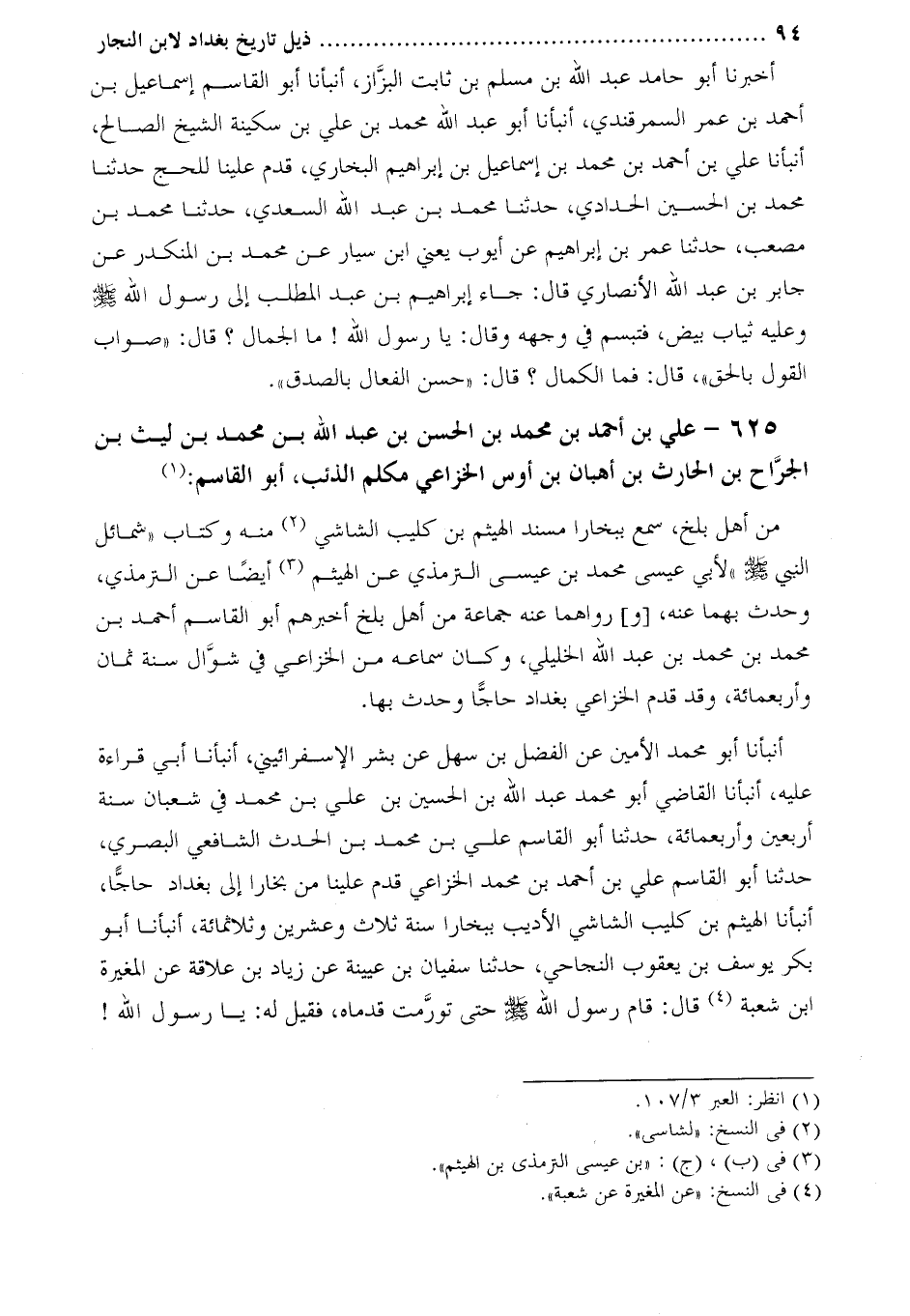 أَنْبَأَنَا أَبُو مُحَمَّدٍ الأَمِينُ عَنِ الْفَضْلِ بْنِ سهل عن بشر الإسفرائيني، أنبأنا أبي قراءة عليه، أنبأنا القاضي أَبُو مُحَمَّدٍ عَبْدُ اللَّهِ بْنُ الْحُسَيْنِ بْنِ عَلِيِّ بْنِ محمد في شعبان سنة أربعين وأربعمائة، حَدَّثَنَا أَبُو الْقَاسِمِ عَلِيُّ بْنُ مُحَمَّدِ بْنِ الْحَدَثِ الشافعي البصري، حَدَّثَنَا أَبُو الْقَاسِمِ عَلِيُّ بْنُ أَحْمَدَ بْنِ محمد الْخُزَاعِيُّ قَدِمَ عَلَيْنَا مِنْ بُخَارَا إِلَى بَغْدَادَ حاجّا، أنبأنا الْهَيْثَمُ بْنُ كُلَيْبٍ الشَّاشِيُّ الأَدِيبُ بِبُخَارَا سَنَةَ ثلاث وعشرين وثلاثمائة، أَنْبَأَنَا أَبُو بَكْرٍ يُوسُفُ بْنُ يَعْقُوبَ النَّجَاحِيُّ، حَدَّثَنَا سُفْيَانُ بْنُ عُيَيْنَةَ عَنْ زِيَادِ بْنِ عِلاقَةَ عن المغيرة ابن شُعْبَةَ [4] قَالَ: قَامَ رَسُولُ اللَّهِ صَلَّى اللَّهُ عَلَيْهِ وَسَلَّمَ حَتَّى تَوَرَّمَتْ قَدَمَاهُ، فَقِيلَ لَهُ: يَا رَسُولَ الله!