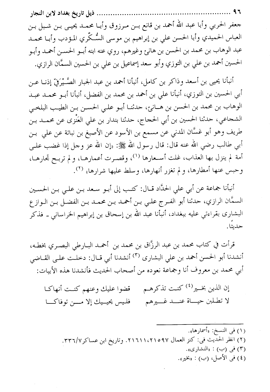 أَنْبَأَنَا يَحْيَى بْنُ أسعد وذاكر بن كامل، أنبأنا أَحْمَدُ بْنُ عَبْدِ الْجَبَّارِ الصَّيْرَفِيُّ إِذْنًا عَنْ أبي الحسين بن التوزي، أَنْبَأَنَا عَلِيُّ بْنُ أَحْمَدَ بْنِ مُحَمَّدِ بْنِ الفضل، أَنْبَأَنَا أَبُو مُحَمَّدٍ عَبْدُ الْوَهَّابِ بْنُ مُحَمَّدِ بن الحسن بن هانئ، حَدَّثَنَا أَبُو عَلِيٍّ الْحَسَنُ بْنُ الطَّيِّبِ الْبَلْخِيُّ الشُّجَاعِيُّ، حدثنا الحسين بن أبي الحجاج، حدثنا بُنْدَارُ بْنُ عَلِيٍّ الْعَنْزِيُّ عَنْ مُحَمَّدِ بْنِ طَرِيفٍ وَهُوَ أَبُو غَسَّانَ الْمَدَنِيُّ عَنْ مِسْمَعِ بْنِ الأَسْوَدِ عَنِ الأَصْبَغُ بْنُ نُبَاتَةَ عَنْ عَلِيّ بْن أَبِي طالب رضي الله عنه قَالَ: قَالَ رَسُولُ اللَّهِ صَلَّى اللَّهُ عَلَيْهِ وَسَلَّمَ: «إِنَّ اللَّهَ عَزَّ وَجَلَّ إِذَا غَضِبَ عَلَى أُمَّةٍ لَمْ يُنْزِلْ بِهَا الْعَذَابَ، غَلَتْ أسعارها [1] ، وقصرت أعمارها، ولم تربح تجارها، وَحُبِسَ عَنْهَا أَمْطَارُهَا، وَلَمْ تَغْزُرْ أَنْهَارُهَا، وَسَلَّطَ عَلَيْهَا شِرَارُهَا» [2] .
