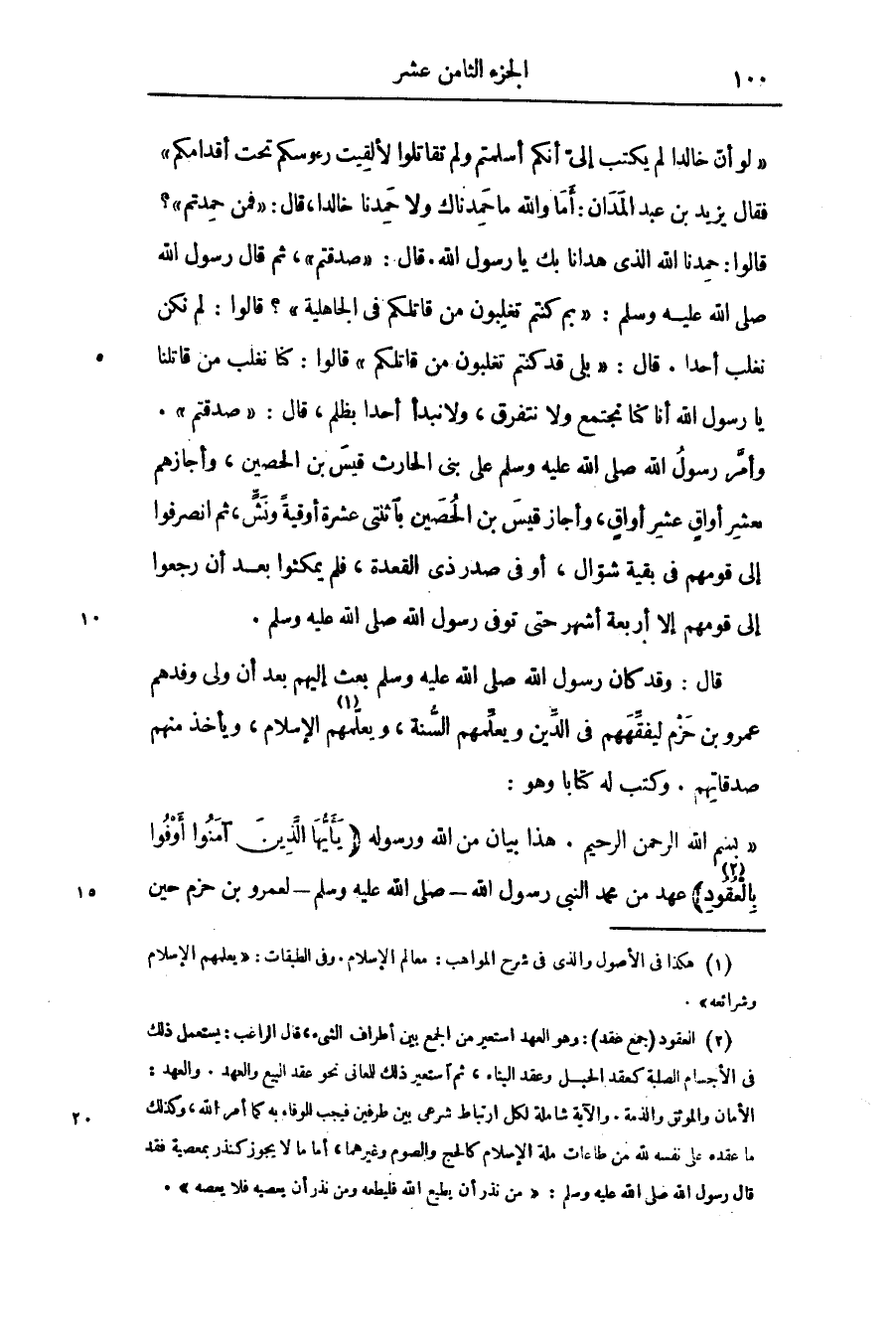 قال: وقد كان رسول الله صلّى الله عليه وسلّم بعث إليهم بعد أن ولى وفدهم عمرو بن حزم ليفقّههم فى الدّين ويعلّمهم السّنة، ويعلّمهم «1» الإسلام، ويأخذ منهم صدقاتهم. وكتب له كتابا وهو: