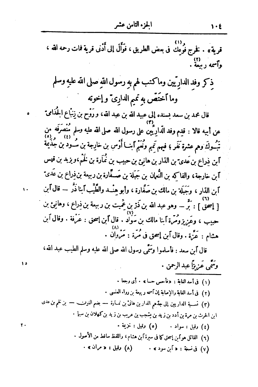 قال محمد بن سعد بسنده إلى عبيد الله بن عبد الله، وروح بن زنباع الجذامىّ عن أبيه قالا: قدم وفد الدّاريّين «3» على رسول الله صلّى الله عليه وسلّم منصرفه من تبوك وهم عشرة نفر؛ فيهم تميم ونعيم ابنا أوس بن خارجة بن سود «4» بن جذيمة «5» ابن ذراع بن عدىّ بن الدّار بن هانئ بن حبيب بن نمارة بن لخم، ويزيد بن قيس ابن خارجة، والفاكه بن النّعمان بن جبلة بن صفّارة بن ربيعة بن ذراع بن عدىّ ابن الدّار، وجبلة بن مالك بن صفّارة، وأبو هند والطّيّب ابناذرّ- قال ابن [إسحق «6» ] : برّ- وهو عبد الله بن ذرّ بن عمّيت بن ربيعة بن ذراع، وهانئ بن حبيب، وعزيز ومرّة ابنا مالك بن سواد. «7» قال ابن إسحق: عرفة. وقال ابن هشام: عزّة. وقال ابن إسحق فى مرّة: مروان «8» .