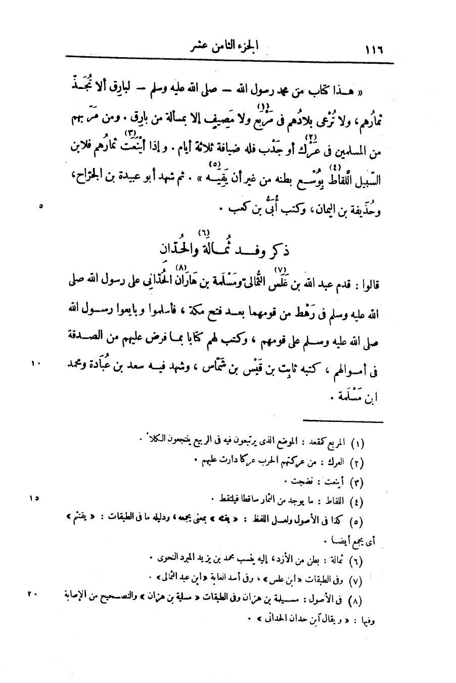 «هذا كتاب من محمد رسول الله- صلى الله عليه وسلّم- لبارق ألا تجذّ ثمارهم، ولا ترعى بلادهم فى مربع «1» ولا مصيف إلا بمسألة من بارق. ومن مرّبهم من المسلمين فى عرك «2» أو جدب فله ضيافة ثلاثة أيام. وإذا أينعت «3» ثمارهم فلابن السّبيل اللّقاط «4» بوسع بطنه من غير أن يقيه «5» » . ثم شهد أبو عبيدة بن الجرّاح، وحذيفة بن اليمان، وكتب أبىّ بن كعب.