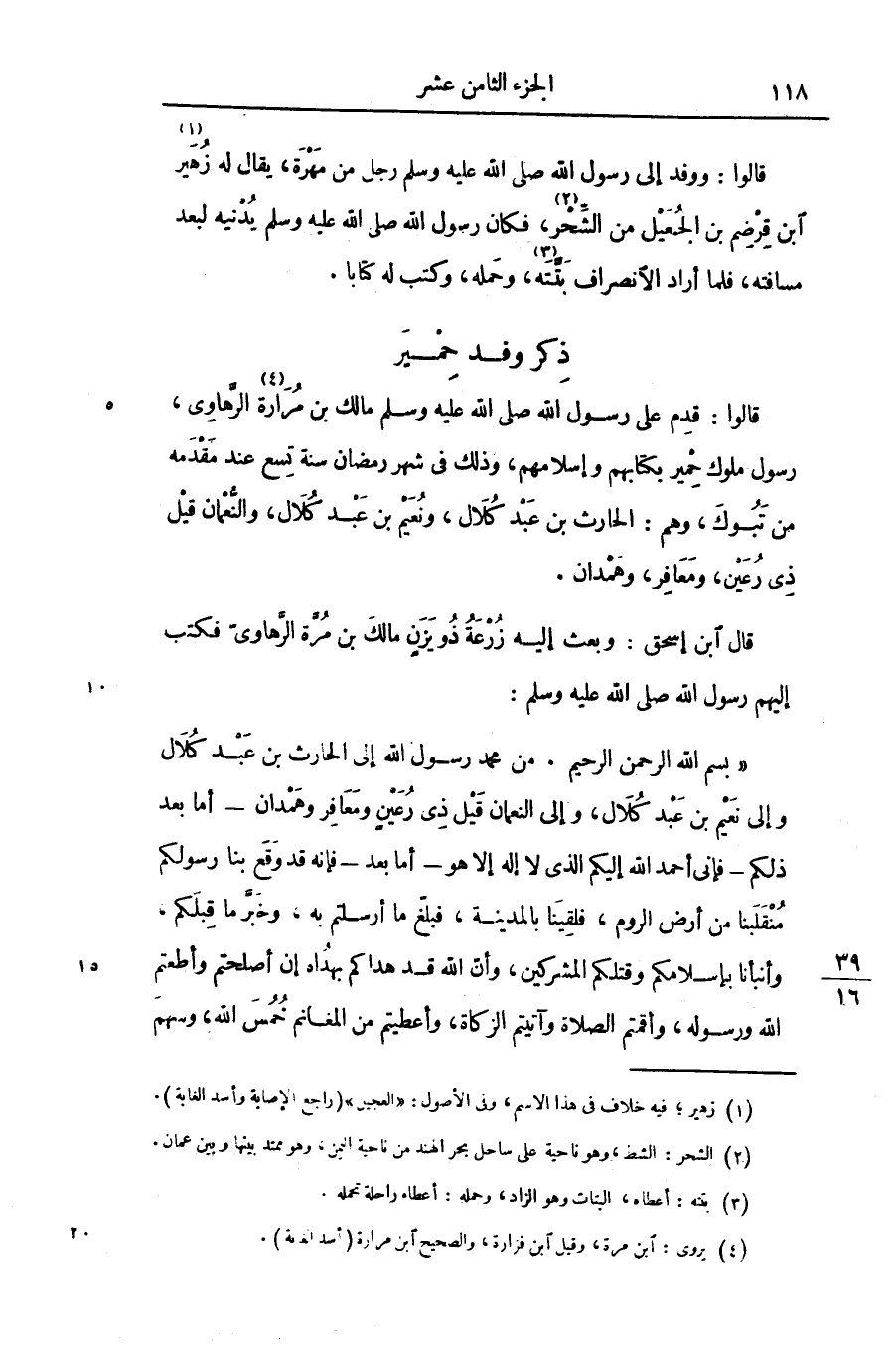 «بسم الله الرحمن الرحيم. من محمد رسول الله إلى الحارث بن عبد كلال وإلى نعيم بن عبد كلال، وإلى النعمان قيل ذى رعين ومعافر وهمدان- أما بعد ذلكم- فإنى أحمد الله إليكم الذى لا إله إلا هو- أما بعد- فإنه قد وقع بنا رسولكم منقلبنا من أرض الروم، فلقينا بالمدينة، فبلّغ ما أرسلتم به، وخبّر ما قبلكم، وأنبأنا بإسلامكم وقتلكم المشركين، وأنّ الله قد هداكم بهداه إن أصلحتم وأطعتم الله ورسوله، وأقمتم الصلاة وآتيتم الزكاة، وأعطيتم من المغانم خمس الله، وسهم