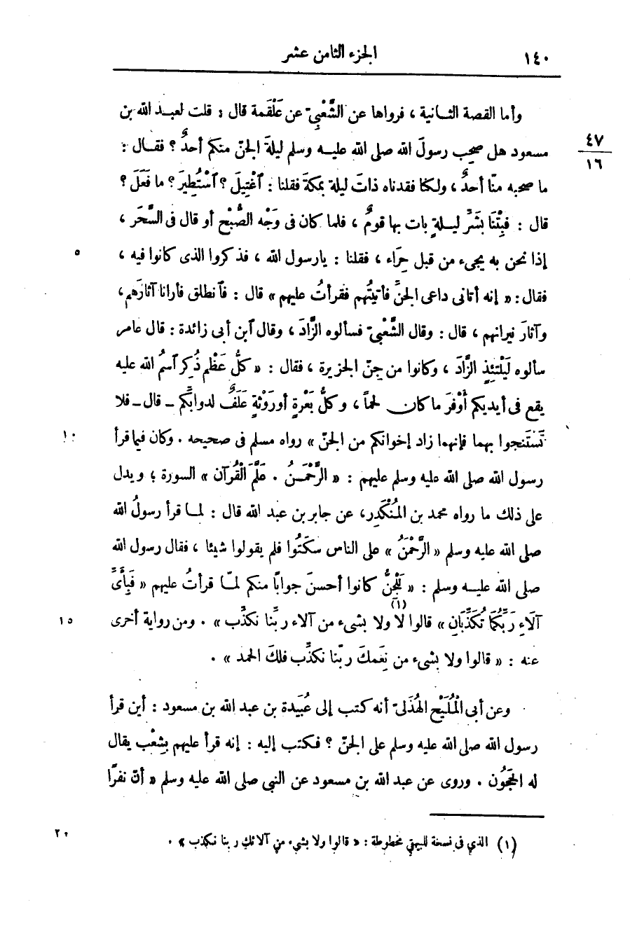 وعن أبى المليح الهذلىّ أنه كتب إلى عبيدة بن عبد الله بن مسعود: أين قرأ رسول الله صلّى الله عليه وسلّم على الجنّ؟ فكتب إليه: إنه قرأ عليهم بشعب يقال له المحجون. وروى عن عبد الله بن مسعود عن النبى صلّى الله عليه وسلّم «أنّ نفرا