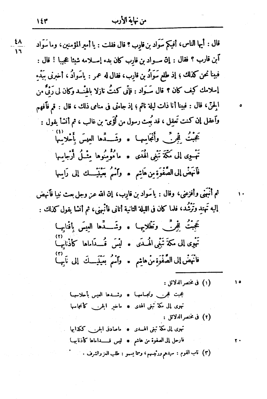 ثم أنبهنى وأفزعنى، وقال: يا سواد بن قارب، إنّ الله عز وجل بعث نبيا فانهض إليه تهتد وترشد، فلما كان فى الليلة الثانية أتانى فأنبهنى، ثم أنشا يقول كذلك: