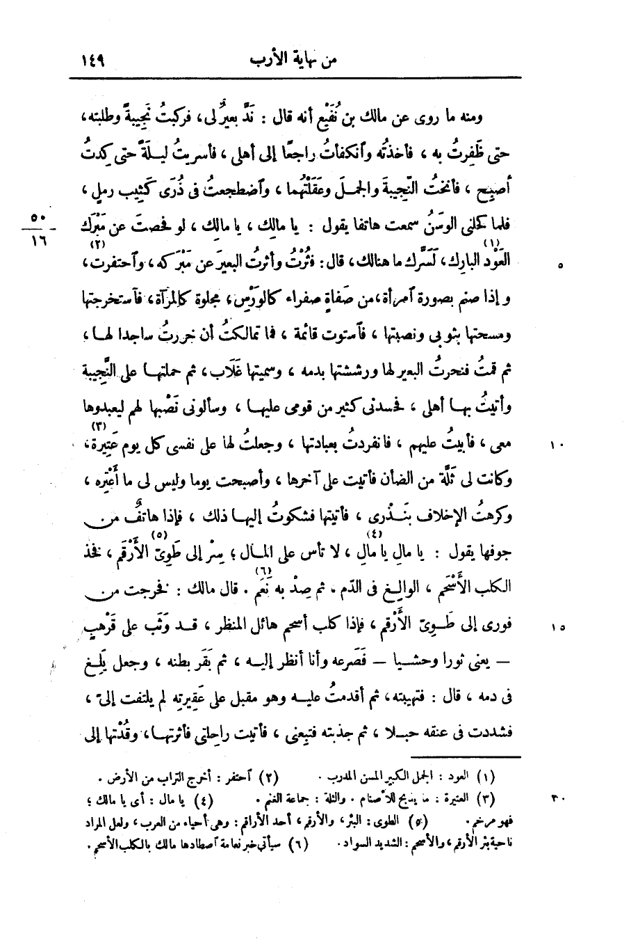 ومنه ما روى عن مالك بن نفيع أنه قال: ندّ بعير لى، فركبت نجيبة وطلبته، حتى ظفرت به، فأخذته وانكفأت راجعا إلى أهلى، فأسريت ليلة حتى كدت أصبح، فأنخت النّجيبة والجمل وعقلتهما، واضطجعت فى ذرى كثيب رمل، فلما كحلنى الوسن سمعت هاتفا يقول: يا مالك، يا مالك، لو فحصت عن مبرك العود «1» البارك، لسرّك ما هنالك، قال: فثرت وأثرت البعير عن مبركه، واحتفرت «2» ، وإذا صنم بصورة امرأة، من صفاة صفراء كالورس، مجلوة كالمرآة، فآستخرجتها ومسحتها بثوبى ونصبتها، فاستوت قائمة، فما تمالكت أن خررت ساجدا لها، ثم قمت فنحرت البعير لها ورششتها بدمه، وسميتها غلاب، ثم حملتها على النّجيبة وأتيت بها أهلى، فحسدنى كثير من قومى عليها، وسألونى نصبها لهم ليعبدوها معى، فأبيت عليهم، فانفردت بعبادتها، وجعلت لها على نفسى كل يوم عتيرة «3» ، وكانت لى ثلّة من الضأن فأتيت على آخرها، وأصبحت يوما وليس لى ما أعتره، وكرهت الإخلاف بنذرى، فأتيتها فشكوت إليها ذلك، فإذا هاتف من جوفها يقول: يا مال يا مال «4» ، لا تأس على المال، سر إلى طوىّ «5» الأرقم، فخذ الكلب الأسحم، الوالغ فى الدّم، ثم صد به نعم «6» . قال مالك: فخرجت من فورى إلى طوىّ الأرقم، فإذا كلب أسحم هائل المنظر، قد وثب على قرهب- يعنى ثورا وحشيا- فصرعه وأنا أنظر إليه، ثم بقر بطنه، وجعل يلغ فى دمه، قال: فتهيبته، ثم أقدمت عليه وهو مقبل على عقيرته لم يلتفت إلىّ، فشددت فى عنقه حبلا، ثم جذبته فتبعنى، فأتيت راحلتى فأثرتها، وقدتها إلى