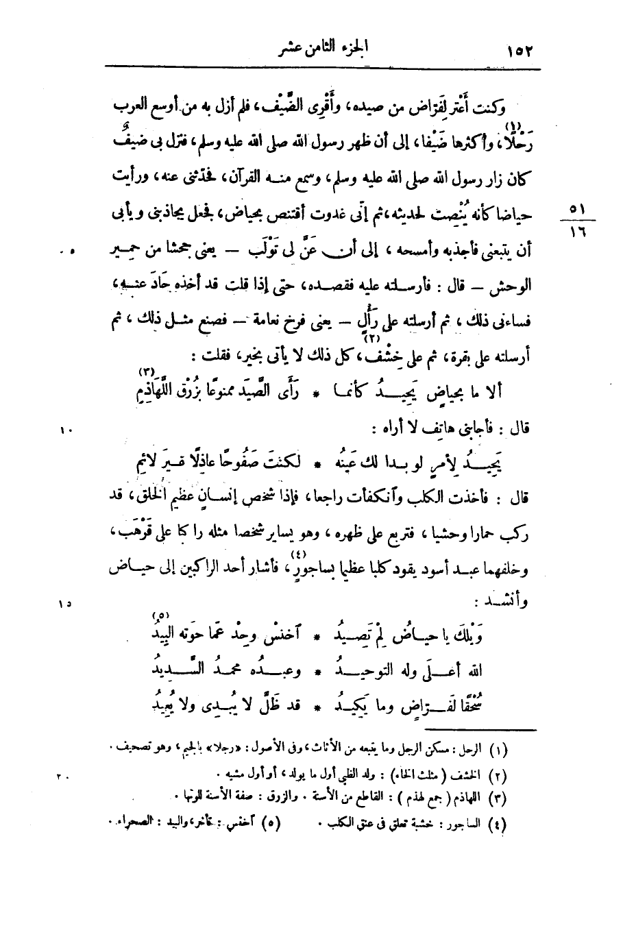 وكنت أعتر لفرّاض من صيده، وأقرى الضّيف، فلم أزل به من أوسع العرب رحلا «1» ، وأكثرها ضيفا، إلى أن ظهر رسول الله صلّى الله عليه وسلّم، فنزل بى ضيف كان زار رسول الله صلّى الله عليه وسلّم، وسمع منه القرآن، فحدّثنى عنه، ورأيت حياضا كأنه ينصت لحديثه، ثم إنّى غدوت أقتنص بحياض، فجعل يجاذبنى ويأبى أن يتبعنى فأجذبه وأمسحه، إلى أن عنّ لى تولب- يعنى جحشا من حمير الوحش- قال: فأرسلته عليه فقصده، حتى إذا قلت قد أخذه حاد عنه، فساءنى ذلك، ثم أرسلته على رأل- يعنى فرخ نعامة- فصنع مثل ذلك، ثم أرسلته على بقرة، ثم على خشف «2» ، كل ذلك لا يأتى بخير، فقلت: