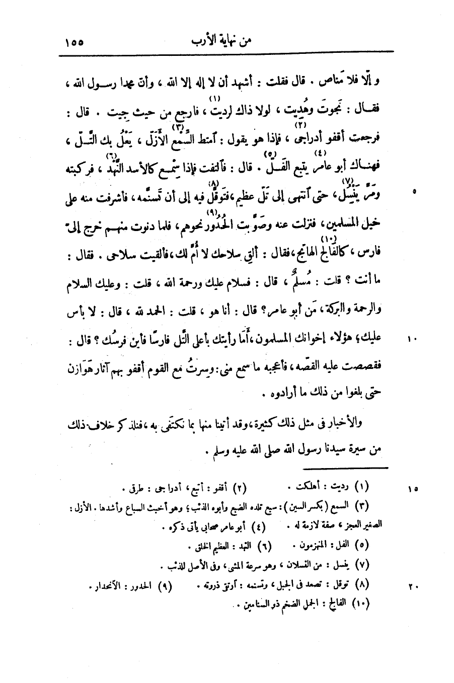 فرجعت أقفو أدراجى «2» ، فإذا هو يقول: امتط السّمع «3» الأزلّ، يعل بك التّلّ، فهناك أبو عامر «4» يتبع الفلّ «5» . قال: فالتفت فإذا سمع كالأسد النّهد «6» ، فركبته ومرّ ينسل «7» ، حتى انتهى إلى تلّ عظيم، فتوقّل «8» فيه إلى أن تسنّمه، فأشرفت منه على خيل المسلمين، فنزلت عنه وصوّبت الحدور «9» نحوهم، فلما دنوت منهم خرج إلىّ فارس، كالفالج «10» الهاتج، فقال: ألق سلاحك لا أمّ لك، فألقيت سلاحى. فقال: