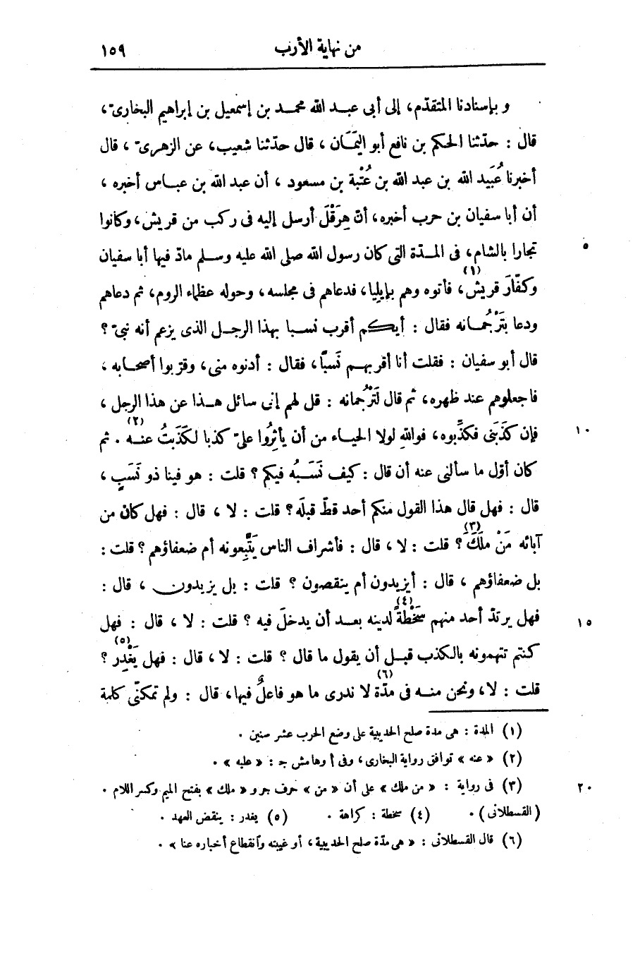 وبإسنادنا المتقدّم، إلى أبى عبد الله محمد بن إسمعيل بن إبراهيم البخارىّ، قال: حدّثنا الحكم بن نافع أبو اليمان، قال حدّثنا شعيب، عن الزهرىّ، قال أخبرنا عبيد الله بن عبد الله بن عتبة بن مسعود، أن عبد الله بن عباس أخبره، أن أبا سفيان بن حرب أخبره، أنّ هرقل أرسل إليه فى ركب من قريش، وكانوا تجارا بالشام، فى المدّة التى كان رسول الله صلّى الله عليه وسلّم مادّ فيها أبا سفيان وكفّار قريش «1» ، فأتوه وهم بإيليا، فدعاهم فى مجلسه، وحوله عظماء الروم، ثم دعاهم ودعا بترجمانه فقال: أيكم أقرب نسبا بهذا الرجل الذى يزعم أنه نبىّ؟