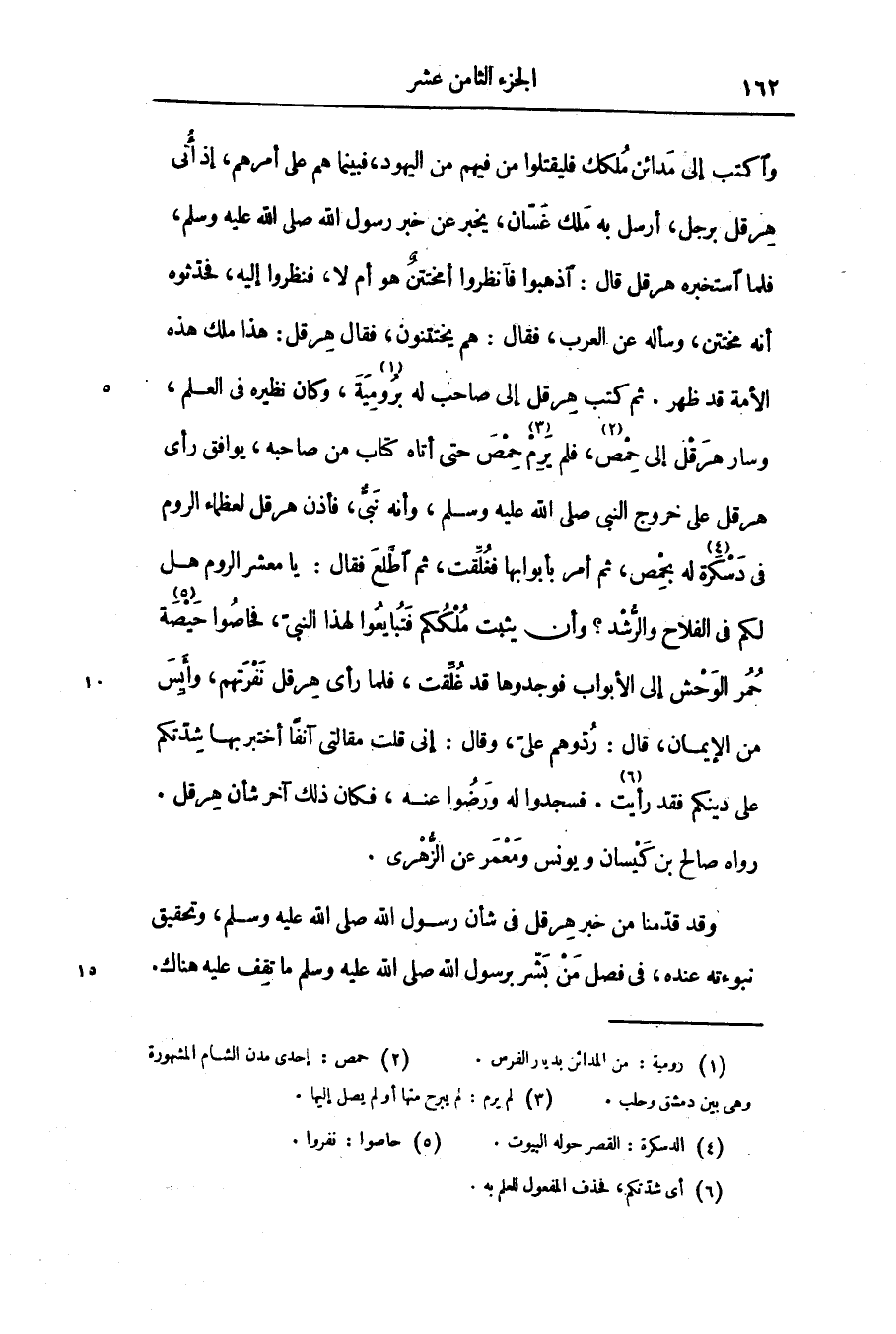 واكتب إلى مدائن ملكك فليقتلوا من فيهم من اليهود، فبينما هم على أمرهم، إذ أتى هرقل برجل، أرسل به ملك غسّان، يخبر عن خبر رسول الله صلّى الله عليه وسلّم، فلما استخبره هرقل قال: اذهبوا فانظروا أمختتن هو أم لا، فنظروا إليه، فحدّثوه أنه مختتن، وسأله عن العرب، فقال: هم يختتنون، فقال هرقل: هذا ملك هذه الأمة قد ظهر. ثم كتب هرقل إلى صاحب له برومية «1» ، وكان نظيره فى العلم، وسار هرقل إلى حمص «2» ، فلم يرم «3» حمص حتى أتاه كتاب من صاحبه، يوافق رأى هرقل على خروج النبى صلّى الله عليه وسلّم، وأنه نبىّ، فأذن هرقل لعظماء الروم فى دسكرة «4» له بحمص، ثم أمر بأبوابها فغلّقت، ثم اطّلع فقال: يا معشر الروم هل لكم فى الفلاح والرّشد؟ وأن يثبت ملككم فتبايعوا لهذا النبىّ، فحاصوا حيصة «5» حمر الوحش إلى الأبواب فوجدوها قد غلّقت، فلما رأى هرقل نفرتهم، وأيس من الإيمان، قال: ردّوهم علىّ، وقال: إنى قلت مقالتى آنفا أختبر بها شدّتكم على دينكم فقد رأيت «6» . فسجدوا له ورضوا عنه، فكان ذلك آخر شأن هرقل.