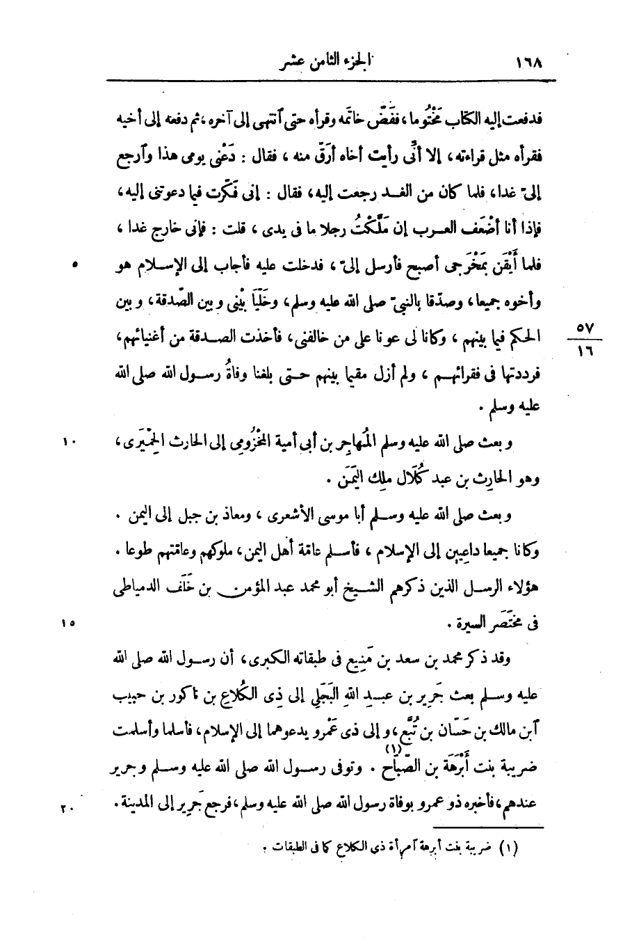 وقد ذكر محمد بن سعد بن منيع فى طبقاته الكبرى، أن رسول الله صلّى الله عليه وسلّم بعث جرير بن عبد الله البجلى إلى ذى الكلاع بن ناكور بن حبيب ابن مالك بن حسّان بن تبّع، وإلى ذى عمرو يدعوهما إلى الإسلام، فأسلما وأسلمت ضريبة بنت أبرهة بن الصّبّاح «1» . وتوفى رسول الله صلّى الله عليه وسلّم وجرير عندهم، فأخبره ذو عمرو بوفاة رسول الله صلّى الله عليه وسلّم، فرجع جرير إلى المدينة.