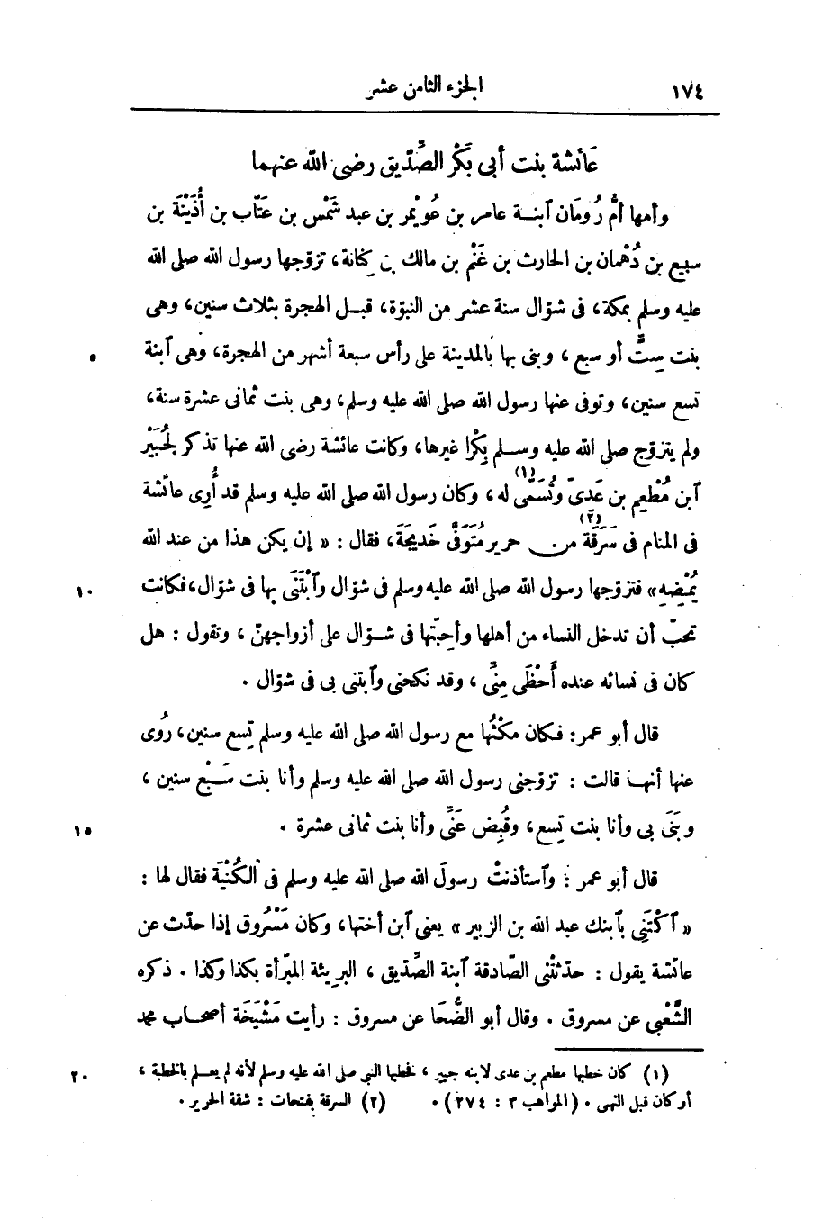 وأمها أمّ رومان ابنة عامر بن عويمر بن عبد شمس بن عتّاب بن أذينة بن سبيع بن دهمان بن الحارث بن غنم بن مالك بن كنانة، تزوّجها رسول الله صلّى الله عليه وسلّم بمكة، فى شوّال سنة عشر من النبوّة، قبل الهجرة بثلاث سنين، وهى بنت ستّ أو سبع، وبنى بها بالمدينة على رأس سبعة أشهر من الهجرة، وهى ابنة تسع سنين، وتوفى عنها رسول الله صلّى الله عليه وسلّم، وهى بنت ثمانى عشرة سنة، ولم يتزوّج صلّى الله عليه وسلّم بكرا غيرها، وكانت عائشة رضى الله عنها تذكر لجبير ابن مطعم بن عدىّ وتسمّى «1» له، وكان رسول الله صلّى الله عليه وسلّم قد أرى عائشة فى المنام فى سرقة «2» من حرير متوفّى خديجة، فقال: «إن يكن هذا من عند الله يمضه» فتزوّجها رسول الله صلّى الله عليه وسلّم فى شوّال وابتنى بها فى شوّال، فكانت تحبّ أن تدخل النساء من أهلها وأحبّتها فى شوّال على أزواجهنّ، وتقول: هل كان فى نسائه عنده أحظى منّى، وقد نكحنى وابتنى بى فى شوّال.