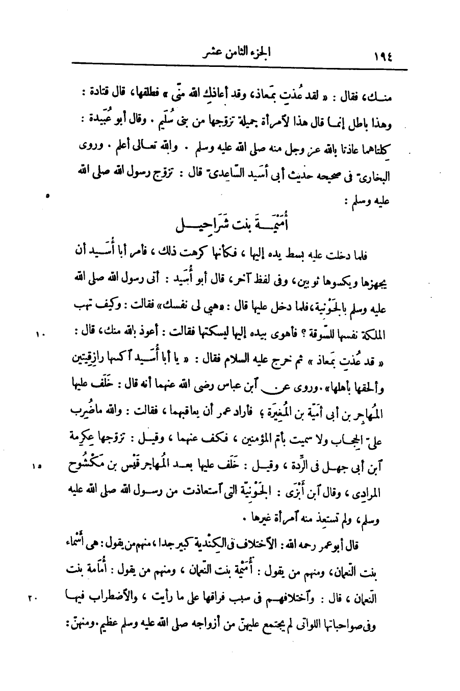 قال أبو عمر رحمه الله: الاختلاف فى الكندية كبير جدا، منهم من يقول: هى أسماء بنت النّعمان، ومنهم من يقول: أميمة بنت النّعمان، ومنهم من يقول: أمامة بنت النّعمان، قال: واختلافهم فى سبب فراقها على ما رأيت، والاضطراب فيها وفى صواحباتها اللواتى لم يجتمع عليهنّ من أزواجه صلّى الله عليه وسلّم عظيم. ومنهنّ: