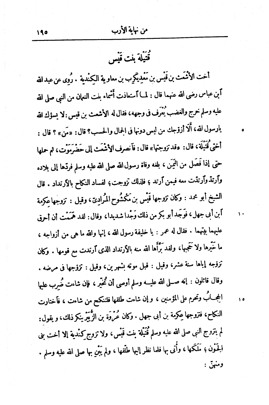 أختى قتيلة، قال: «قد تزوجتها» قال: فانصرف الأشعث إلى حضر موت، ثم حملها حتى إذا فصل من اليمن، بلغه وفاة رسول الله صلّى الله عليه وسلّم فردّها إلى بلاده وارتدّ وارتدّت معه فيمن ارتد؛ فلذلك تزوجت؛ لفساد النكاح بالارتداد. قال الشيخ أبو محمد: وكان تزوجها قيس بن مكشوح المرادىّ، وقيل: تزوجها عكرمة ابن أبى جهل، فوجد أبو بكر من ذلك وجدا شديدا، وقال: لقد هممت أن أحرق عليهما بيتهما. فقال له عمر: يا خليفة رسول الله، إنها والله ما هى من أزواجه، ما خيّرها ولا حجبها، ولقد برّأها الله منه بالارتداد الذى ارتدت مع قومها. وكان تزوّجه إياها سنة عشر، وقيل: قبل موته بشهرين، وقيل: تزوّجها فى مرضه.
