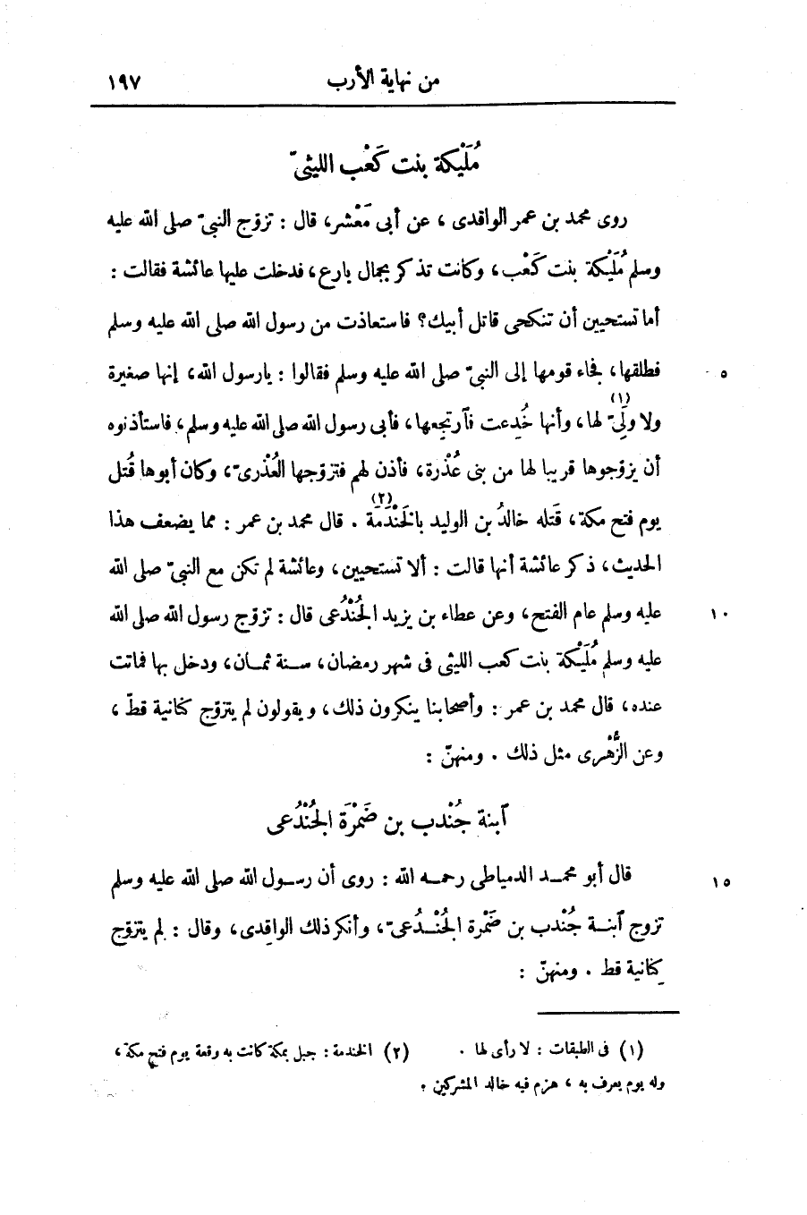 قال أبو محمد الدمياطى رحمه الله: روى أن رسول الله صلّى الله عليه وسلّم تزوج ابنة جندب بن ضمرة الجندعىّ، وأنكر ذلك الواقدى، وقال: لم يتزوّج كنانية قط. ومنهنّ: