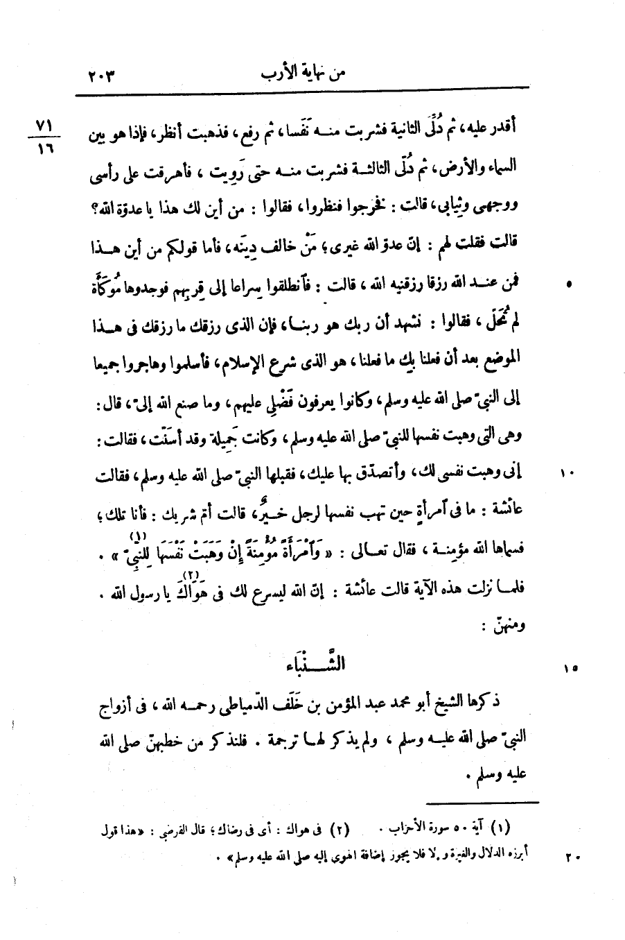 إنى وهبت نفسى لك، وأتصدّق بها عليك، فقبلها النبىّ صلّى الله عليه وسلّم، فقالت عائشة: ما فى امرأة حين تهب نفسها لرجل خير، قالت أمّ شريك: فأنا تلك؛ فسماها الله مؤمنة، فقال تعالى: «وَامْرَأَةً مُؤْمِنَةً إِنْ وَهَبَتْ نَفْسَها لِلنَّبِيِّ «1» » .