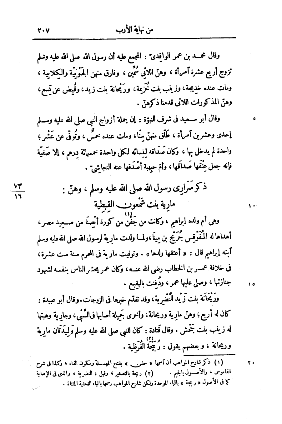 مارية بنت شمعون القبطية وهى أم ولده إبراهيم، وكانت من جفن «1» من كورة أنصنا من صعيد مصر، أهداها له المقوقس جريح بن مينا، ولما ولدت مارية لرسول الله صلّى الله عليه وسلّم ابنه إبراهيم قال: «أعتقها ولدها» . وتوفيت مارية فى المحرم سنة ست عشرة، فى خلافة عمر بن الخطاب رضى الله عنه، وكان عمر يحشر الناس بنفسه لشهود جنازتها، وصلّى عليها عمر، ودفنت بالبقيع.