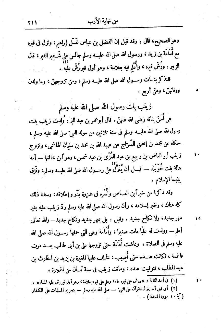 وقد ذكرنا من خبر ابن العاص وأسره فى غزوة بدر وإطلاقه، وسقنا ذلك كله هناك، وخبر إسلامه، وأنّ رسول الله صلّى الله عليه وسلّم ردّ زينب عليه بغير مهر جديد، ولا نكاح جديد. وقيل: بل بمهر جديد ونكاح جديد- والله تعالى أعلم- وولدت له عليّا مات صغيرا، وأمامة وهى التى حملها رسول الله صلّى الله عليه وسلّم فى الصلاة، وعاشت أمامة حتى تزوجها على بن أبى طالب بعد موت فاطمة، فكانت عنده حتى أصيب، فخلف عليها المغيرة بن يزيد بن الحارث بن عبد المطلب، فتوفيت عنده، وماتت زينب فى سنة ثمان من الهجرة.