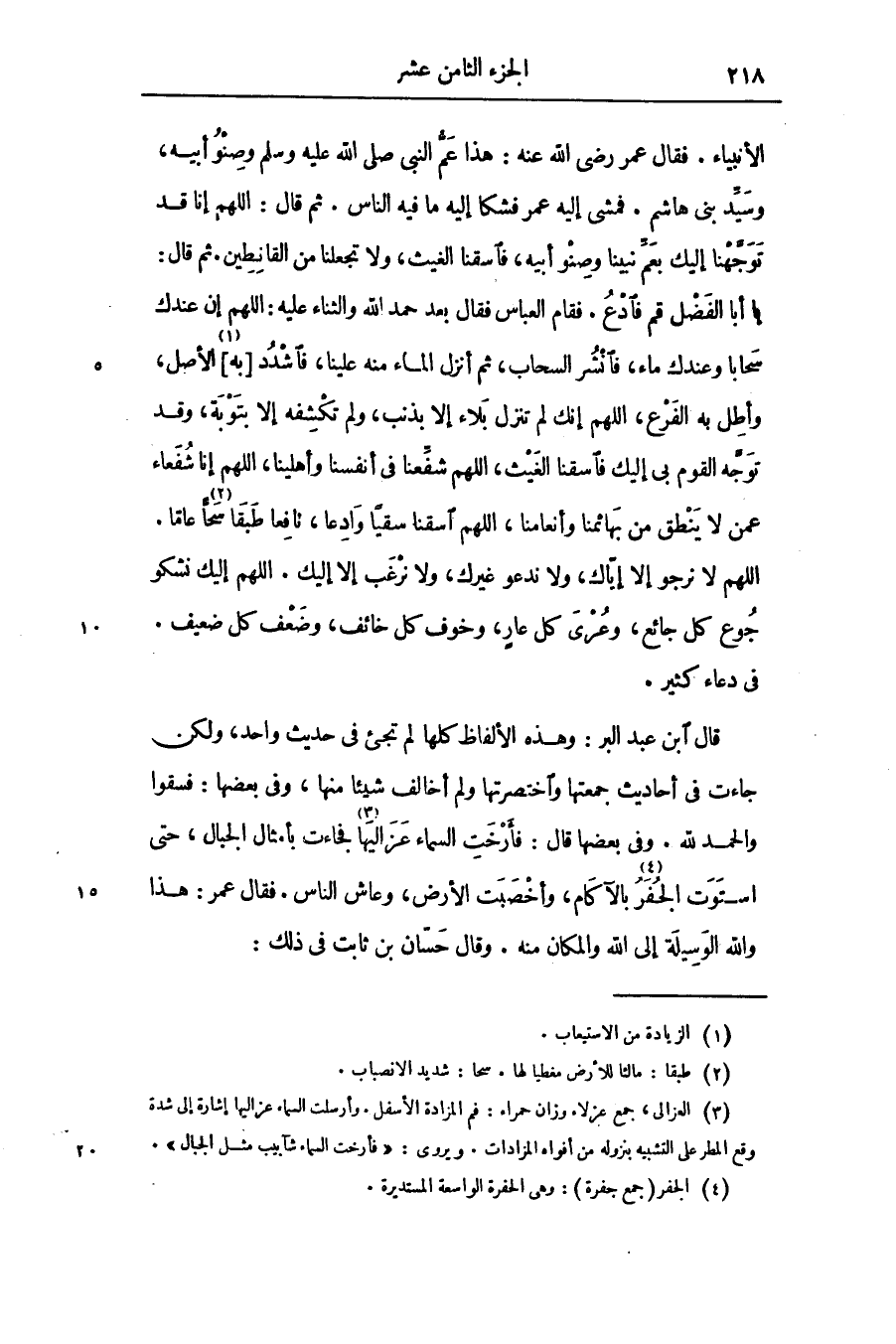 قال ابن عبد البر: وهذه الألفاظ كلها لم تجىء فى حديث واحد، ولكن جاءت فى أحاديث جمعتها واختصرتها ولم أخالف شيئا منها، وفى بعضها: فسقوا والحمد لله. وفى بعضها قال: فأرخت السماء عزاليها «3» فجاءت بأمثال الجبال، حتى استوت الجفر «4» بالآكام، وأخصبت الأرض، وعاش الناس. فقال عمر: هذا والله الوسيلة إلى الله والمكان منه. وقال حسّان بن ثابت فى ذلك: