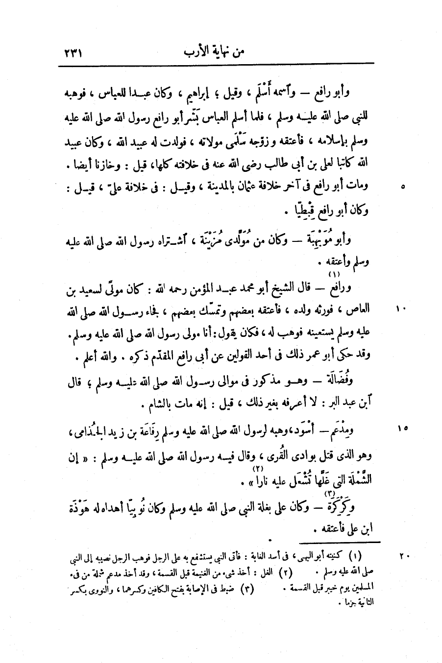 - واسمه أسلم، وقيل؛ إبراهيم، وكان عبدا للعباس، فوهبه للنبى صلّى الله عليه وسلّم، فلما أسلم العباس بشّر أبو رافع رسول الله صلّى الله عليه وسلّم بإسلامه، فأعتقه وزوّجه سلمى مولاته، فولدت له عبيد الله، وكان عبيد الله كاتبا لعلى بن أبى طالب رضى الله عنه فى خلافته كلها، قيل: وخازنا أيضا.