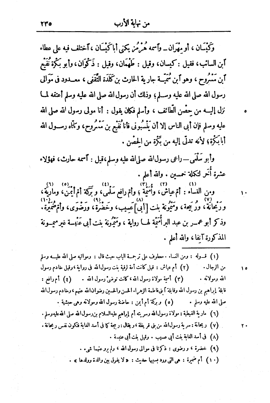 «1» : أمّ عياش «2» ، وأميمة «3» ؛ وأمّ رافع سلمى «4» ، وبركة أمّ أيمن «5» ، ومارية «6» ، وريحانة «7» ، وربيحة، وميمونة بنت [أبى «8» ] عسيب، وخضرة «9» ، ورضوى، وأمّ ضميرة «10» .
