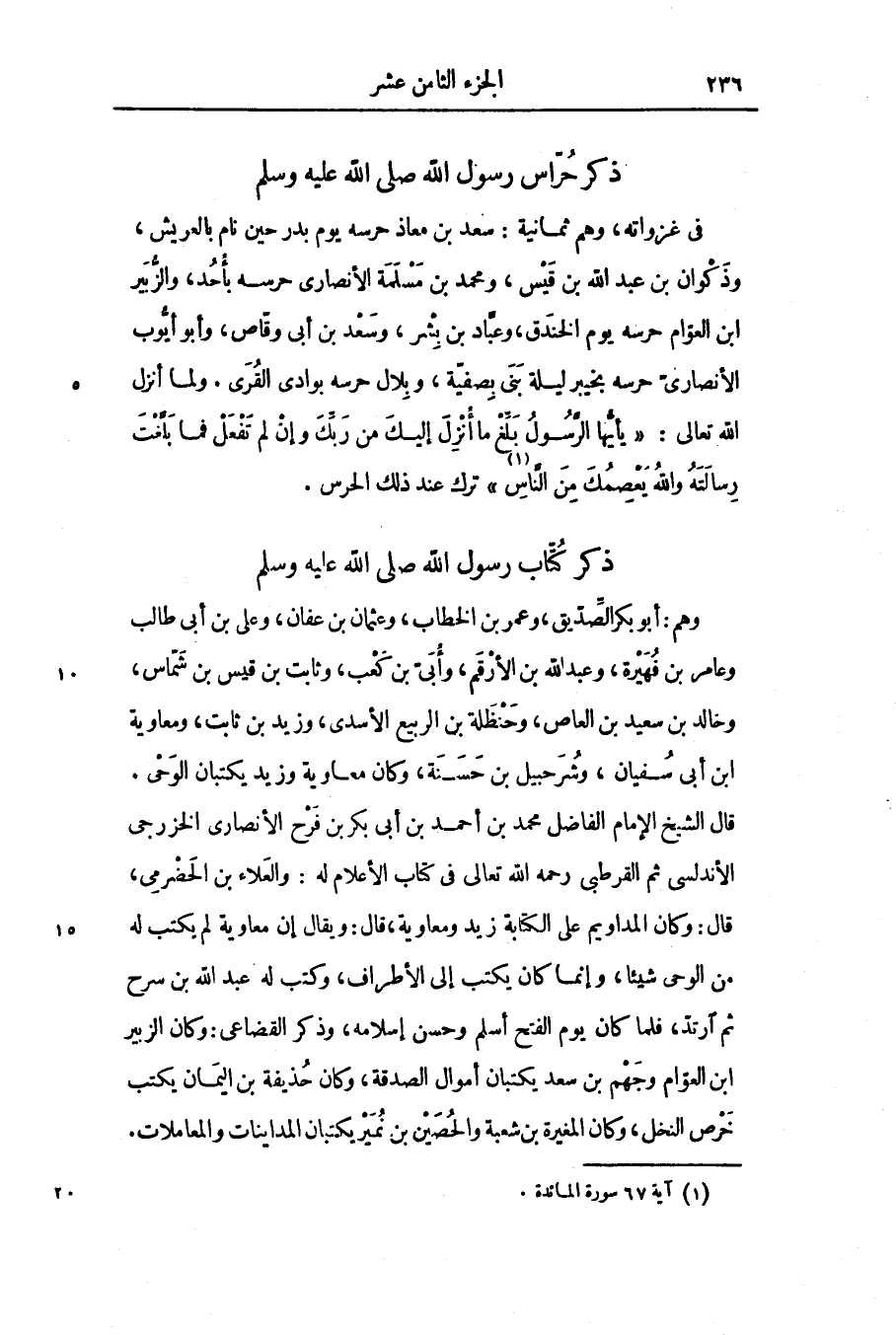 فى غزواته، وهم ثمانية: سعد بن معاذ حرسه يوم بدر حين نام بالعريش، وذكوان بن عبد الله بن قيس، ومحمد بن مسلمة الأنصارى حرسه بأحد، والزّبير ابن العوّام حرسه يوم الخندق، وعبّاد بن بشر، وسعد بن أبى وقّاص، وأبو أيّوب الأنصارىّ حرسه بخيبر ليلة بنى بصفيّة، وبلال حرسه بوادى القرى. ولما أنزل الله تعالى: «يأيّها الرّسول بلّغ ما أنزل إليك من ربّك وإن لم تفعل فما بلّغت رسالته والله يعصمك من النّاس «1» » ترك عند ذلك الحرس.