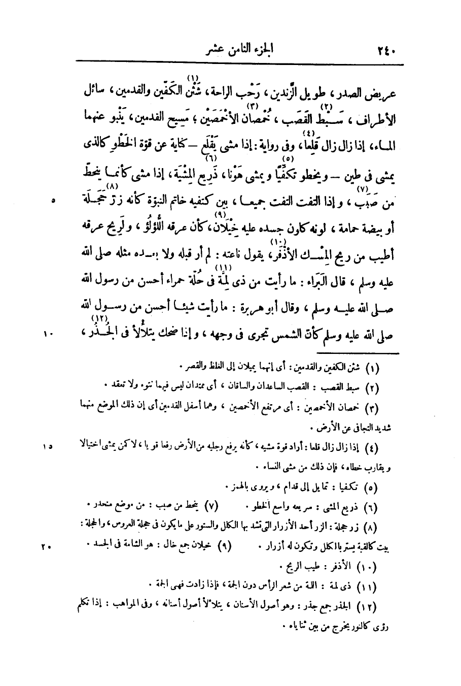 عريض الصدر، طويل الزّندين، رحب الراحة، شثن «1» الكفّين والقدمين، سائل الأطراف، سبط «2» القصب، خمصان «3» الأخمصين؛ مسيح القدمين، ينبو عنهما الماء، إذا زال زال قلعا «4» ، وفى رواية: إذا مشى يقلع- كناية عن قوّة الخطو كالذى يمشى فى طين- ويخطو تكفّيا «5» ويمشى هونا، ذريع «6» المشية، إذا مشى كأنما ينحطّ من صبب «7» ، وإذا التفت التفت جميعا، بين كتفيه خاتم النبوّة كأنه زرّ «8» حجلة أو بيضة حمامة، لونه كلون جسده عليه خيلان «9» ، كأن عرقه الّلؤلؤ، ولريح عرقه أطيب من ريح المسك الأذفر «10» ، يقول ناعته: لم أر قبله ولا بعده مثله صلّى الله عليه وسلّم، قال البراء: ما رأيت من ذى لمّة «11» في حلّة حمراء أحسن من رسول الله صلّى الله عليه وسلّم، وقال أبو هريرة: ما رأيت شيئا أحسن من رسول الله صلّى الله عليه وسلّم كأنّ الشمس تجرى فى وجهه، وإذا ضحك يتلألأ فى الجذر «12» ،