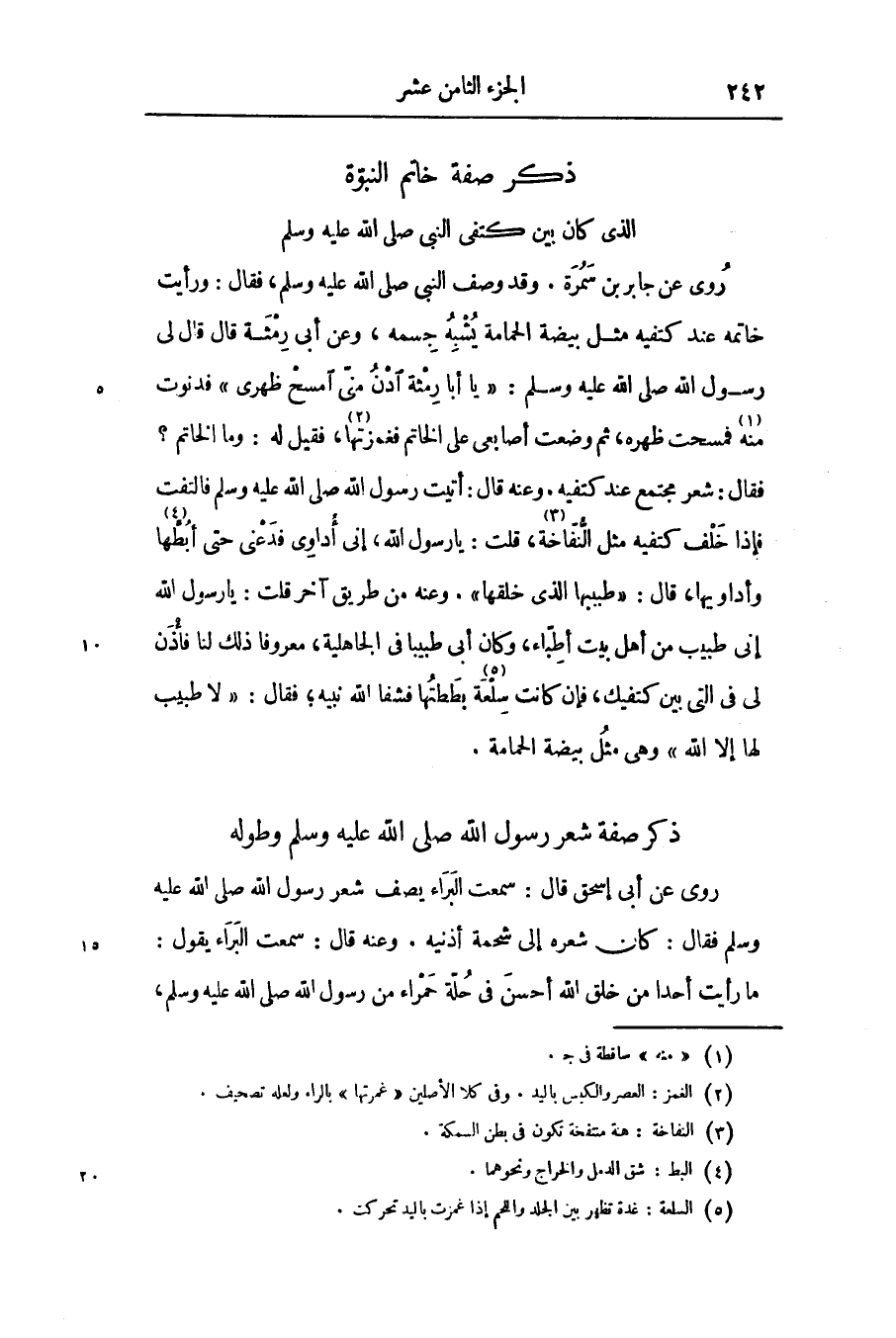 فقال: شعر مجتمع عند كتفيه. وعنه قال: أتيت رسول الله صلّى الله عليه وسلّم فالتفت فإذا خلف كتفيه مثل النّفّاخة «3» ، قلت: يا رسول الله، إنى أداوى فدعنى حتى أبطّها «4» وأداويها، قال: «طبّبها الذى خلقها» . وعنه من طريق آخر قلت: يا رسول الله إنى طبيب من أهل بيت أطبّاء، وكان أبى طبيبا فى الجاهلية، معروفا ذلك لنا فأذن لى فى التى بين كتفيك، فإن كانت سلعة «5» بططتها فشفا الله نبيه؛ فقال: «لا طبيب لها إلا الله» وهى مثل بيضة الحمامة.