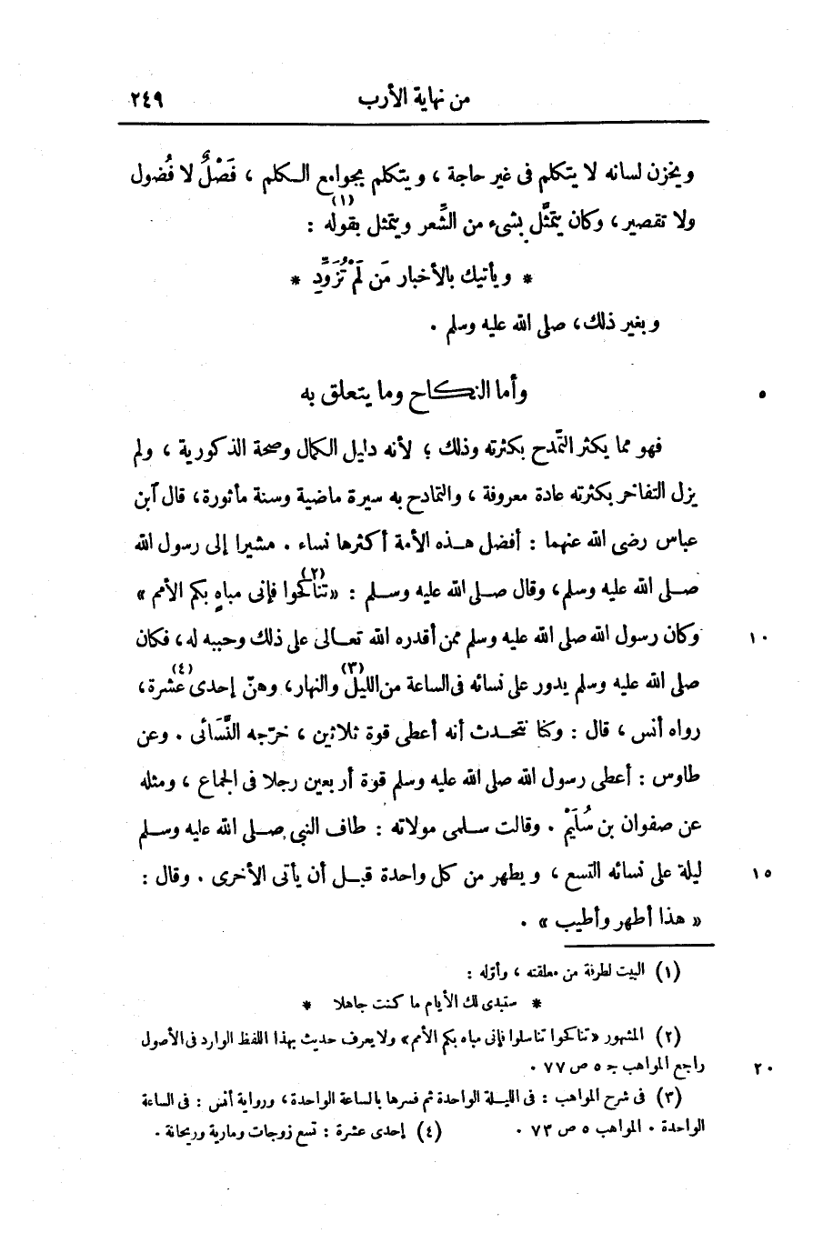 فهو مما يكثر التّمدح بكثرته وذلك؛ لأنه دليل الكمال وصحة الذكورية، ولم يزل التفاخر بكثرته عادة معروفة، والتمادح به سيرة ماضية وسنة مأثورة، قال ابن عباس رضى الله عنهما: أفضل هذه الأمة أكثرها نساء. مشيرا إلى رسول الله صلّى الله عليه وسلّم، وقال صلّى الله عليه وسلّم: «تناكحوا «2» فإنى مباه بكم الأمم» وكان رسول الله صلّى الله عليه وسلّم ممن أقدره الله تعالى على ذلك وحببه له، فكان صلّى الله عليه وسلّم يدور على نسائه فى الساعة من الليل «3» والنهار، وهنّ إحدى «4» عشرة، رواه أنس، قال: وكنا نتحدث أنه أعطى قوة ثلاثين، خرّجه النّسائى. وعن طاوس: أعطى رسول الله صلّى الله عليه وسلّم قوة أربعين رجلا فى الجماع، ومثله عن صفوان بن سليم. وقالت سلمى مولاته: طاف النبى صلّى الله عليه وسلّم ليلة على نسائه التسع، ويطهر من كل واحدة قبل أن يأتى الأخرى. وقال: