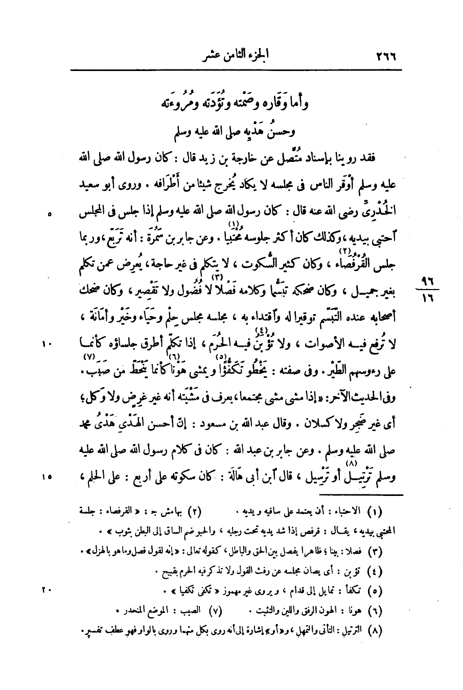 وفى الحديث الآخر: «إذا مشى مشى مجتمعا، يعرف فى مشيته أنه غير غرض ولا وكل؛ أى غير ضجر ولا كسلان. وقال عبد الله بن مسعود: إنّ أحسن الهدى هدى محمد صلّى الله عليه وسلّم. وعن جابر بن عبد الله: كان فى كلام رسول الله صلّى الله عليه وسلّم ترتيل «8» أو ترسيل، قال ابن أبى هالة: كان سكوته على أربع: على الحلم،