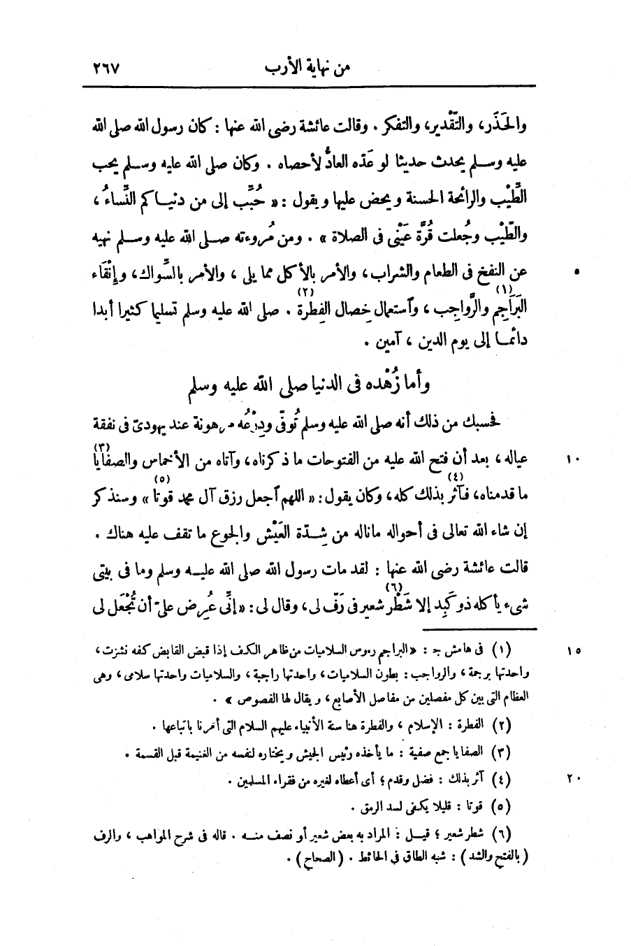 قالت عائشة رضى الله عنها: لقد مات رسول الله صلّى الله عليه وسلّم وما فى بيتى شىء يأكله ذو كبد إلا شطر «6» شعير فى رفّ لى، وقال لى: «إنّى عرض علىّ أن تجعل لى