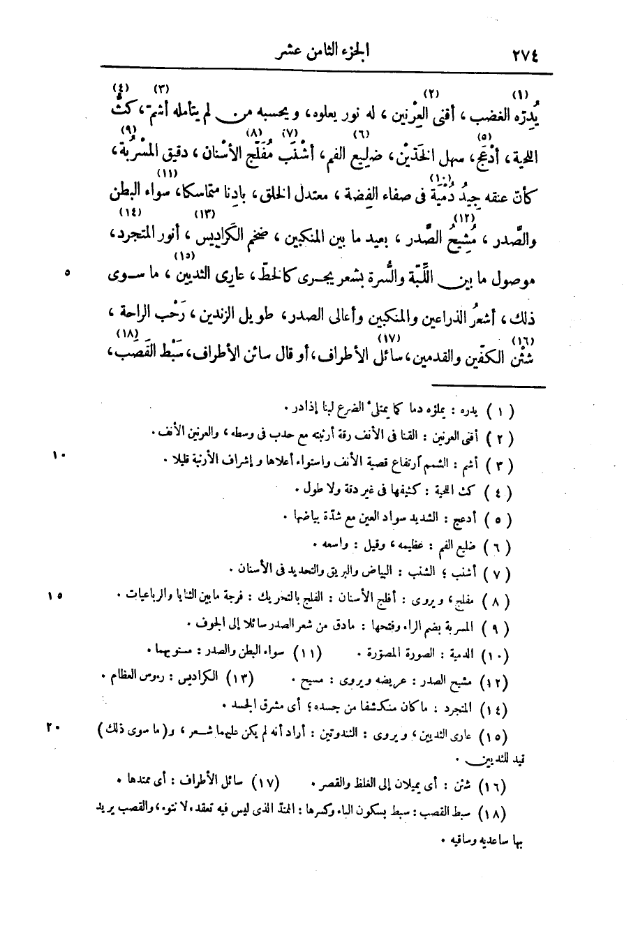يدرّه «1» الغضب، أقنى «2» العرنين، له نور يعلوه، ويحسبه من لم يتأمله أشمّ «3» ، كثّ «4» اللحية، أدعج «5» ، سهل الخدّين، ضليع «6» الفم، أشنب «7» مفلّج «8» الأسنان، دقيق المسربة «9» ، كأنّ عنقه جيد دمية «10» في صفاء الفضة، معتدل الخلق، بادنا متماسكا، «11» سواء البطن والصّدر، مشيح «12» الصّدر، بعيد ما بين المنكبين، ضخم الكراديس «13» ، أنور المتجرد «14» ، موصول ما بين اللّبّة والسّرة بشعر يجرى كالخطّ، عارى الثديين «15» ، ما سوى ذلك، أشعر الذراعين والمنكبين وأعالى الصدر، طويل الزندين، رحب الراحة، شثن «16» الكفّين والقدمين، سائل «17» الأطراف، أو قال سائن الأطراف، سبط القصب «18» ،