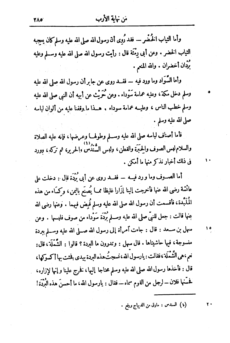 فأما أصناف لباسه صلّى الله عليه وسلّم وطولها وعرضها، فإنه عليه الصلاة والسلام لبس الصوف والحبرة والقطن، ولبس السّندس «1» والحرير، ثم تركه، وورد فى ذلك أخبار نذكر منها ما أمكن.