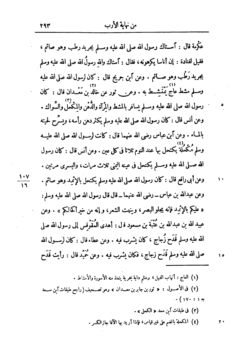 وعن أنس قال: كان رسول الله صلّى الله عليه وسلّم يكثر دهن رأسه، ويسّرح لحيته بالماء. وعن ابن عباس رضى الله عنهما قال: كانت لرسول الله صلّى الله عليه وسلّم مكحلة «4» يكتحل بها عند النوم ثلاثا فى كل عين. وعن أنس قال: كان رسول الله صلّى الله عليه وسلّم يكتحل فى عينه اليمنى ثلاث مرات، واليسرى مرتين.